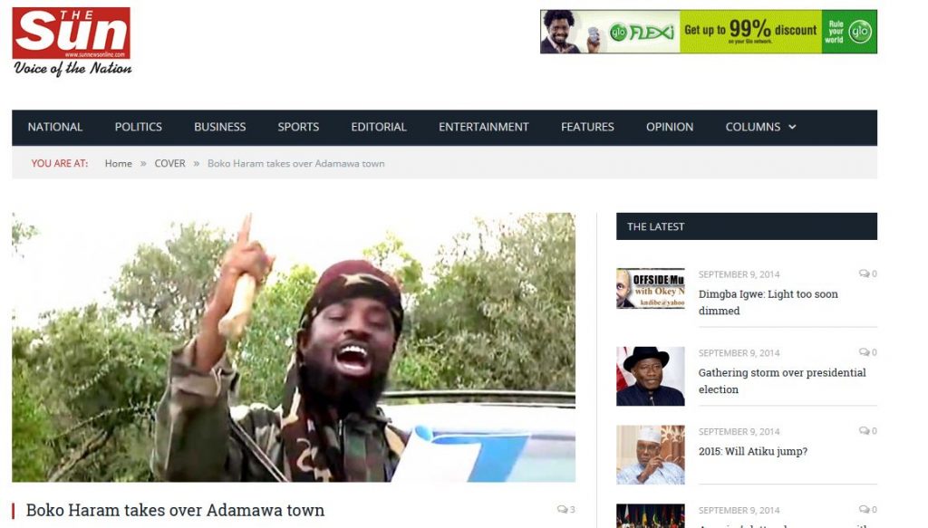 Image: A headline in The Sun, a Nigerian tabloid daily, reports a military advance by Boko Haram last weekend under a video image of the group's leader, Abubakar Shekau. (The Sun/www.sunnewsonline.com)