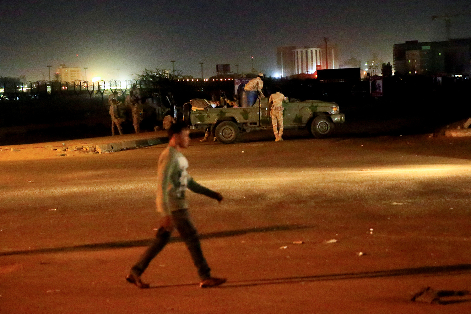 Image: A civilian walks past members of the Sudanese Rapid Support Forces (RSF) are seen near the area where gunmen opened fire outside buildings used by Sudan's National Intelligence and Security Service (NISS) in Khartoum, Sudan January 14, 2020. REUTERS/Mohamed Nureldin Abdallah