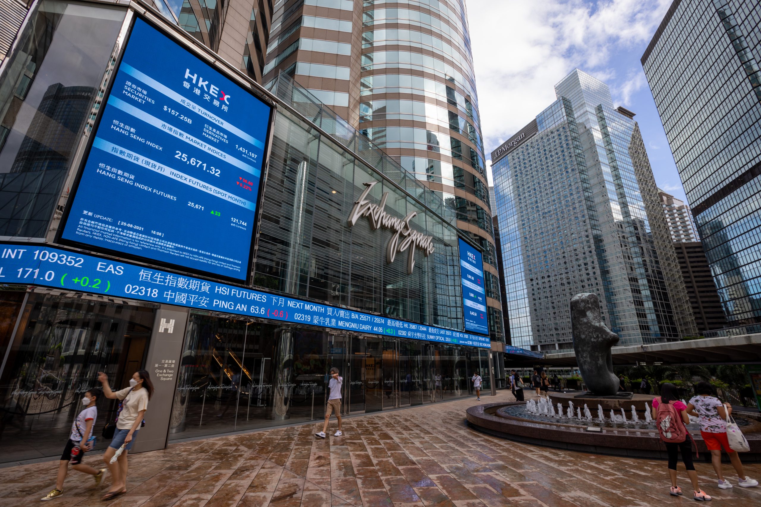 Image: Hong Kong - August 25, 2021 : People walk past the Exchange Square complex, which houses the Hong Kong Stock Exchange (HKEX) in Central, Hong Kong.