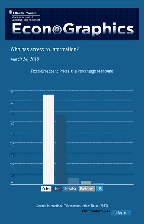 The cost for Cubans to access telecommunications like the internet or mobile phones is prohibitively high: paying for fixed broadband would take more than 85.79% of an average Cuban’s salary, or $21.5, a sky-high rate compared even with its neighboring islands in the region.