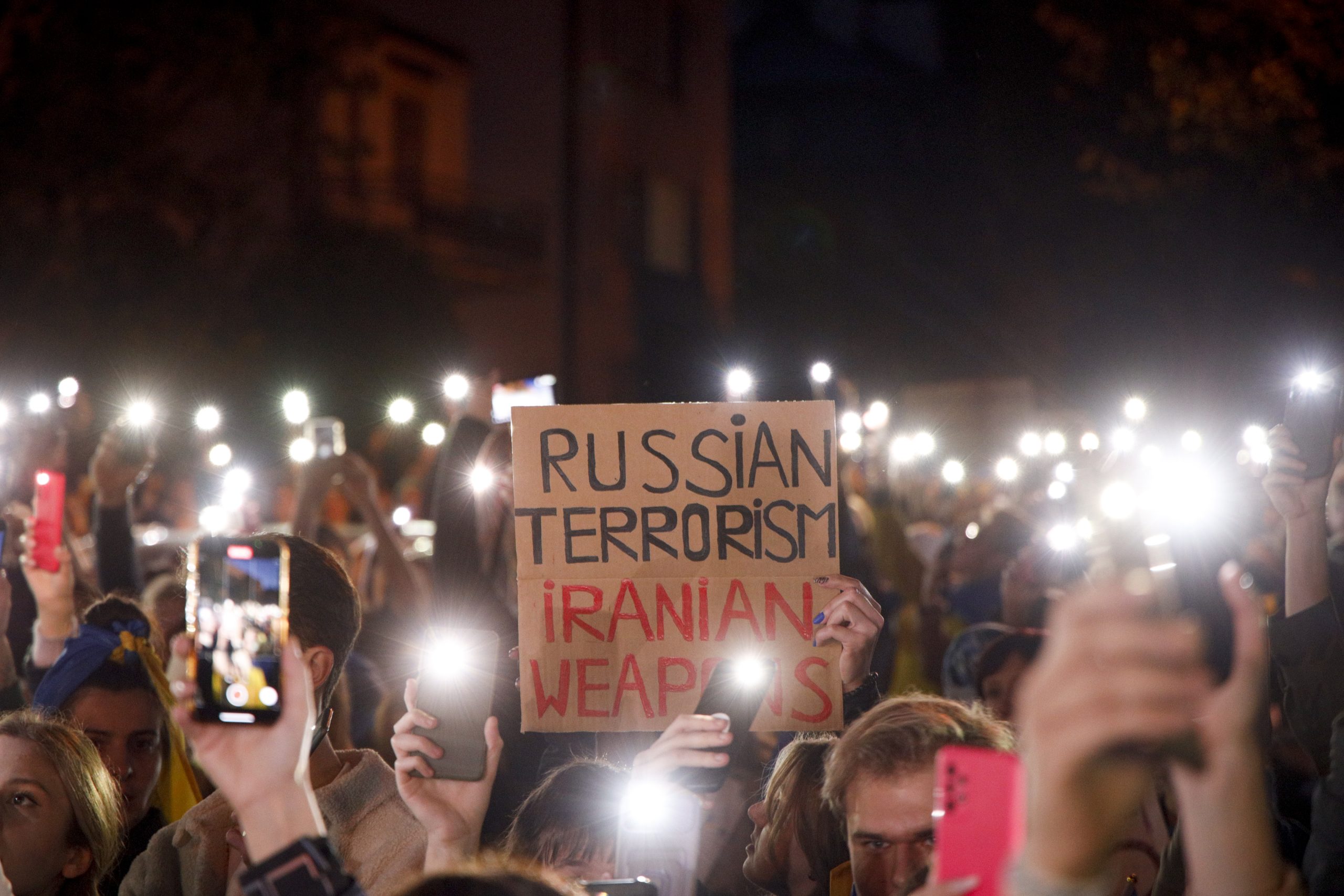 Image: Protesters hold up their phones with flashlights lit during a protest in Warsaw, Poland on 17 October, 2022. Several hundred people gathered in front of the Iranian embassy to protest the supply of loitering Shahed drones to Russia. Russia is using the Iranian manufactured drones to attack Ukraine. Several dozen people have already died and critical infrastructure damaged in major cities after use of the Shahed drones by Russia. (Photo by Jaap Arriens / Sipa USA) (Photo by STR/NurPhoto)