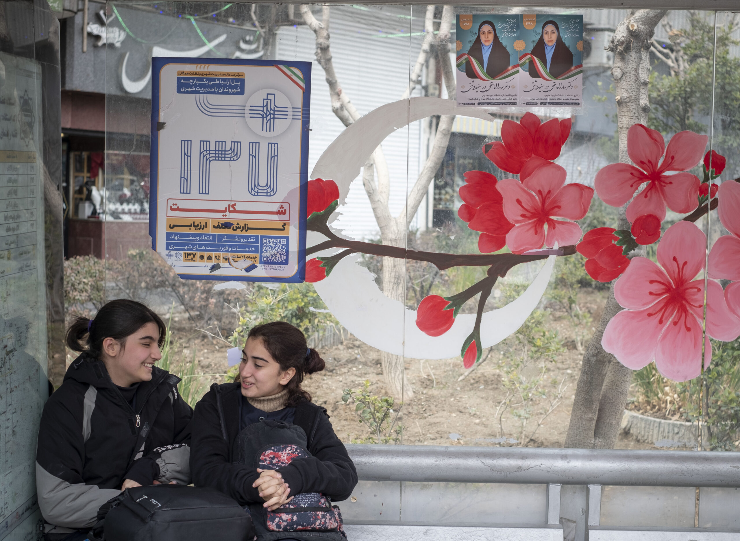Image: Two Iranian schoolgirls are sitting together without wearing mandatory headscarves under two electoral posters at a bus stand in downtown Tehran, Iran, on February 26, 2024, four days before the parliamentary elections. The Iranian Parliament elections are set to be held on March 1st. (Photo by Morteza Nikoubazl/NurPhoto)