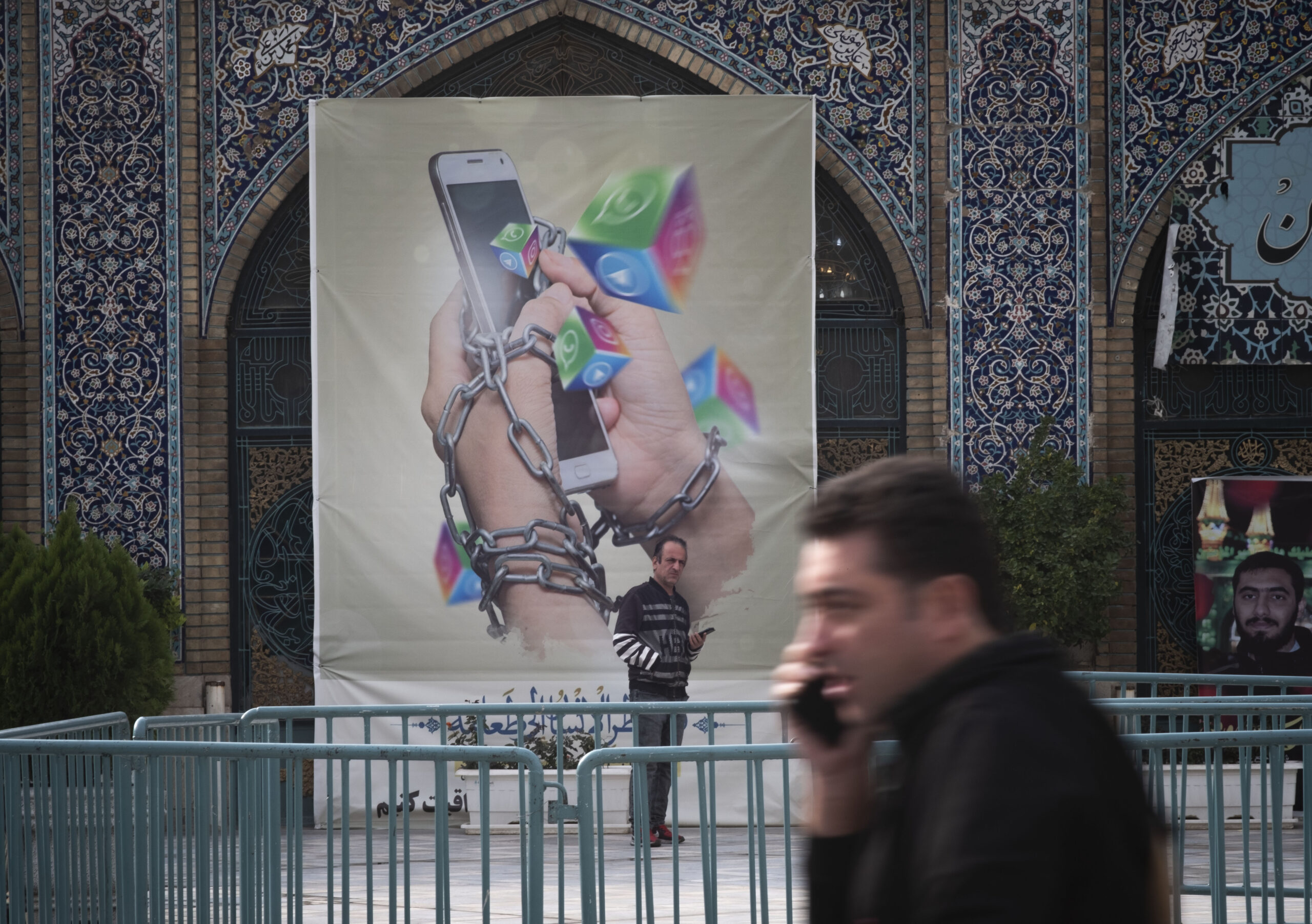 Image: An Iranian man holding his smartphone looks on while standing under an anti-Social networking banner in Tehran Grand Bazaar (Market), December 3, 2022. (Photo by Morteza Nikoubazl/NurPhoto)