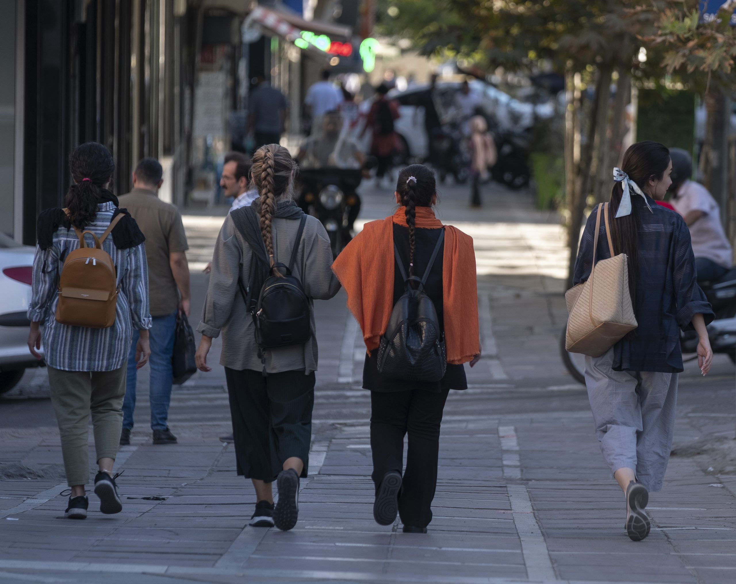 Image: Iranian women without wearing mandatory headscarves, walk along an avenue in downtown Tehran, September 12, 2023. (Photo by Morteza Nikoubazl/NurPhoto)