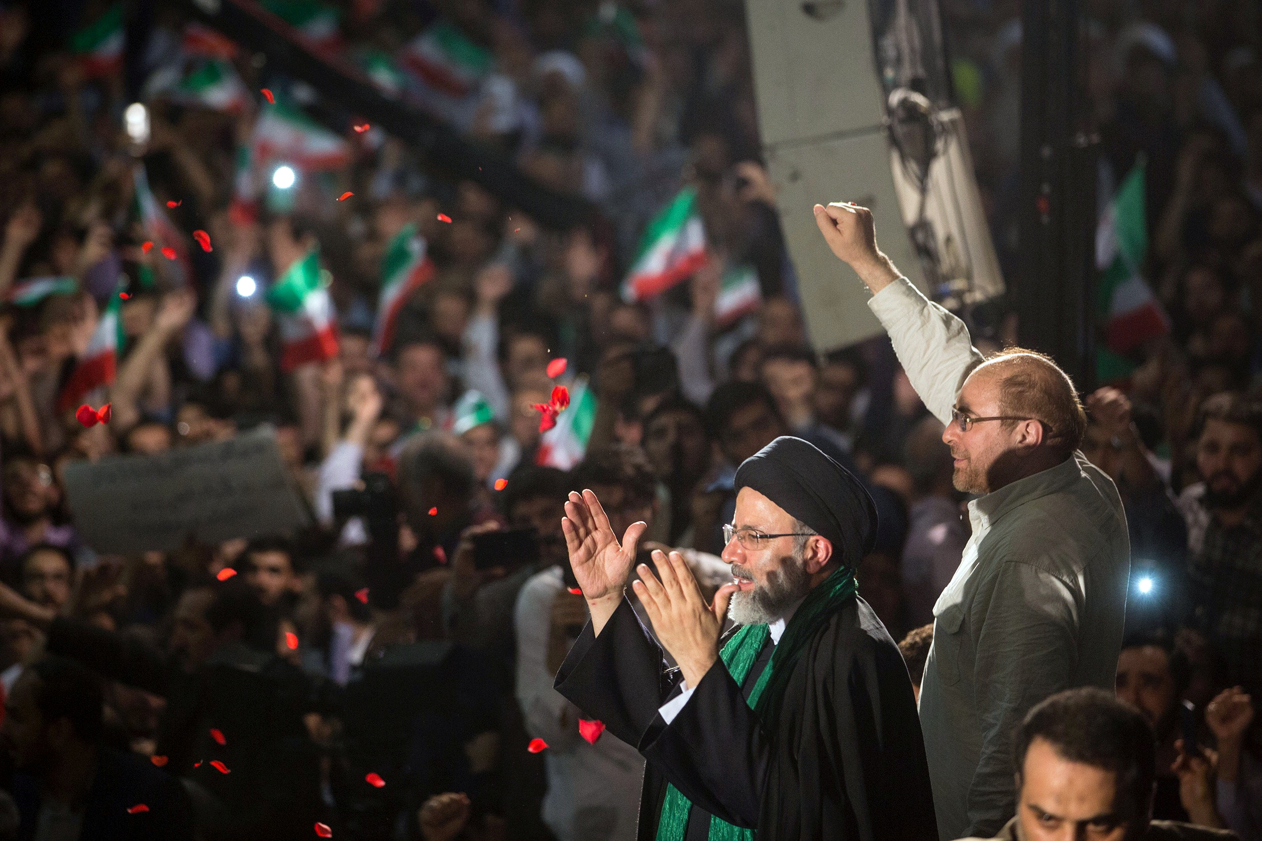 Image: Iranian Presidential candidate Ebrahim Raisi (L) and Tehran Mayor Mohammad Baqer Qalibaf gesture during a campaign meeting at the Mosalla mosque in Tehran, Iran, May 16, 2017. Picture taken May 16, 2017. TIMA via REUTERS