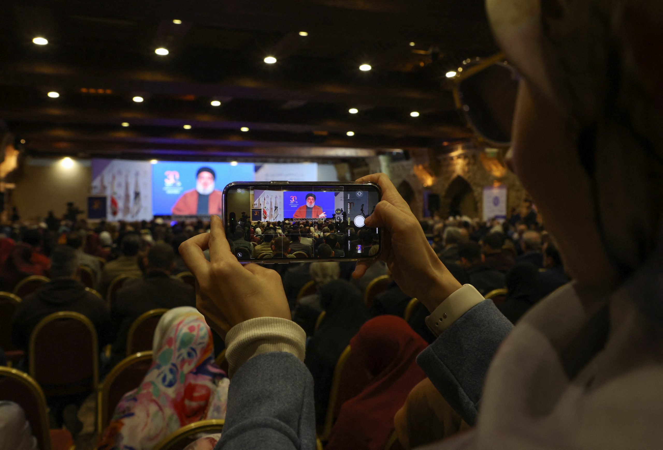 Image: A supporter of Lebanon's Hezbollah leader Sayyed Hassan Nasrallah uses a mobile phone to take a picture as he addresses his supporters through a screen in Beirut's southern suburbs, in Beirut, Lebanon January 19, 2023. REUTERS/Mohamed Azakir