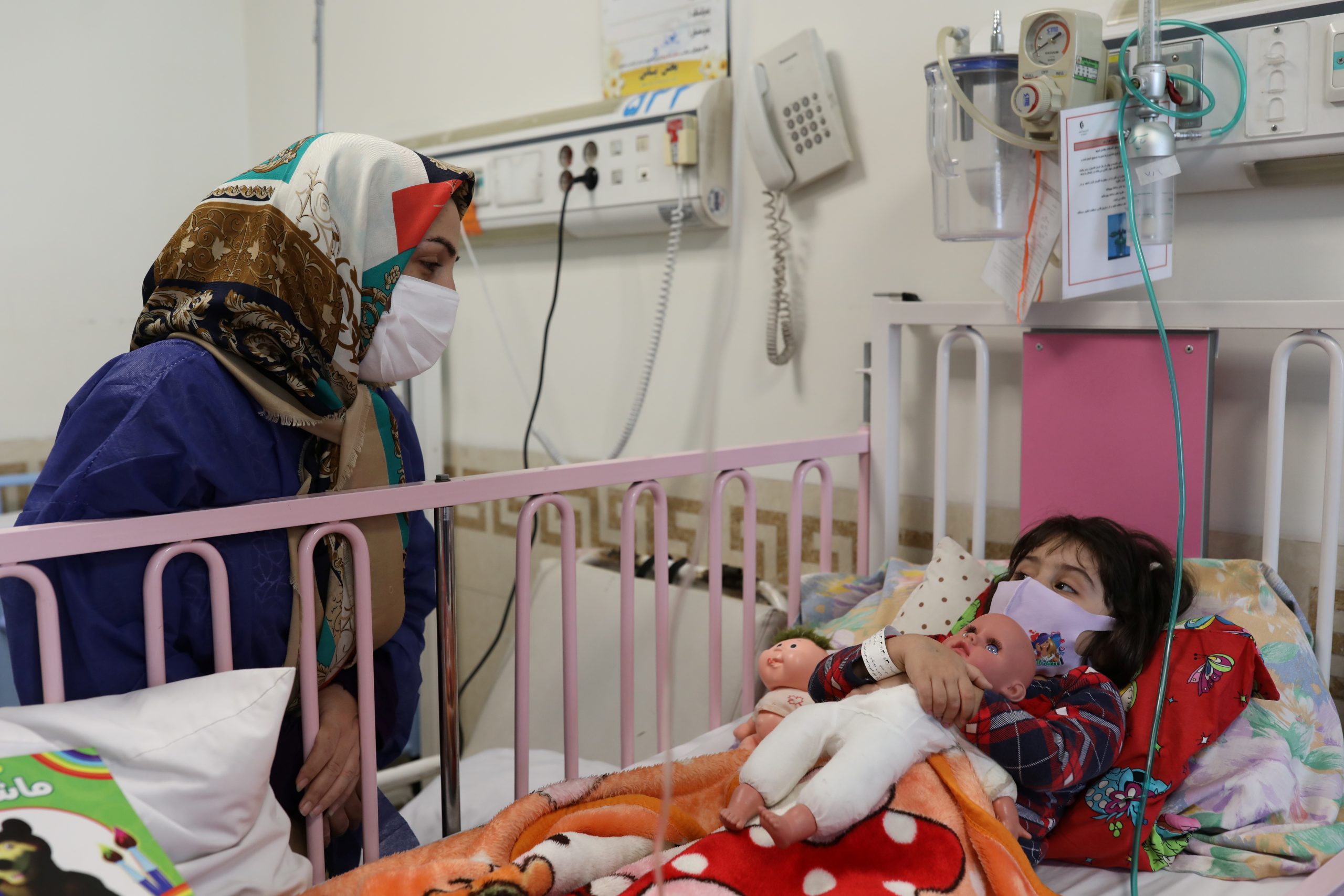 Image: Hadiyeh, 4, an Iranian child who is affected by the coronavirus disease (COVID-19), looks at her mother at Hazrate Ali Asghar Hospital, in Tehran, Iran September 27, 2020. Picture taken September 27, 2020. Majid Asgaripour/WANA (West Asia News Agency) via REUTERS