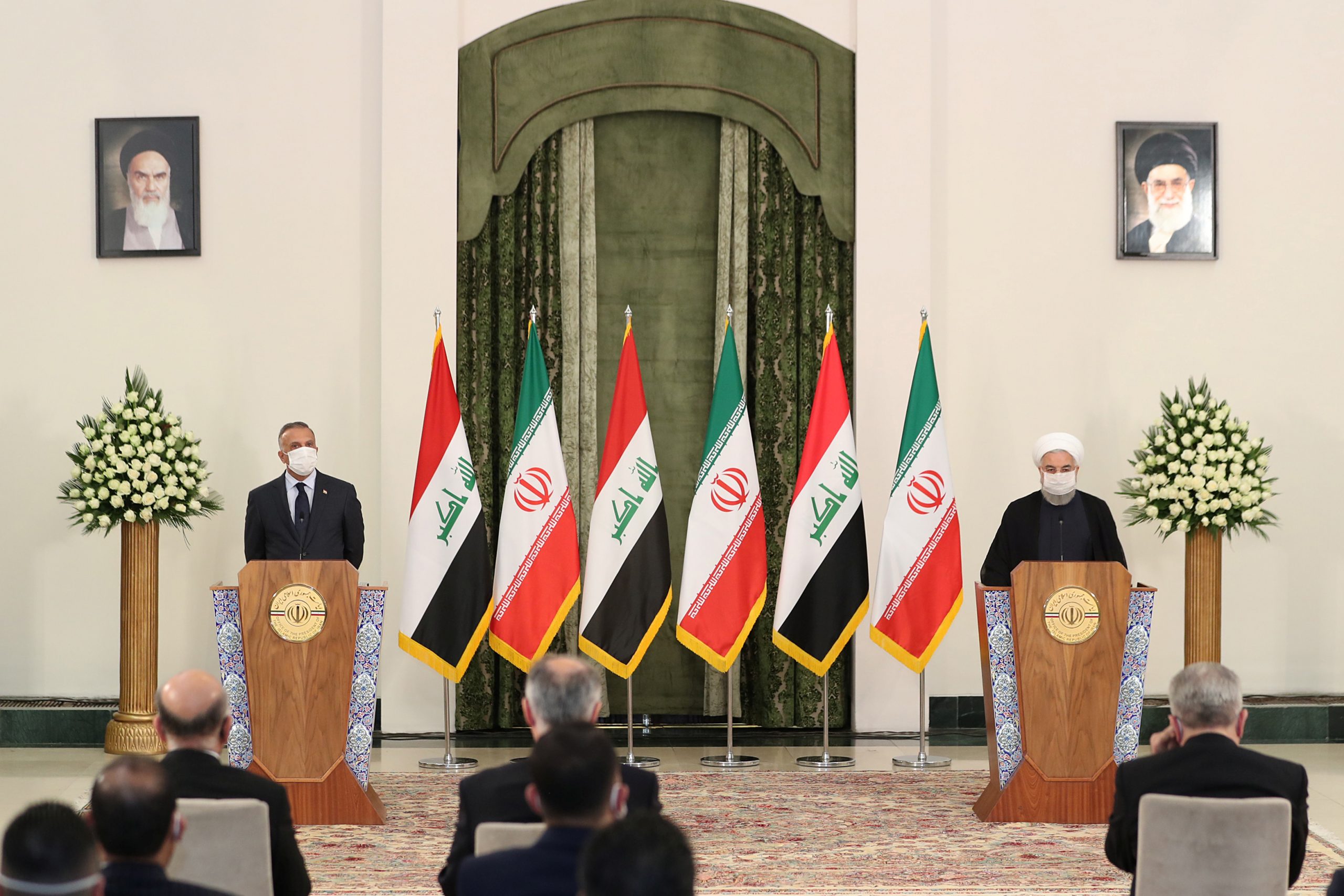 Image: Iranian President Hassan Rouhani and the Iraqi Prime Minister Mustafa al-Kadhimi attend a news conference as they wear protective masks, in Tehran, Iran, July 21 2020. Official Presidential website/Handout via REUTERS