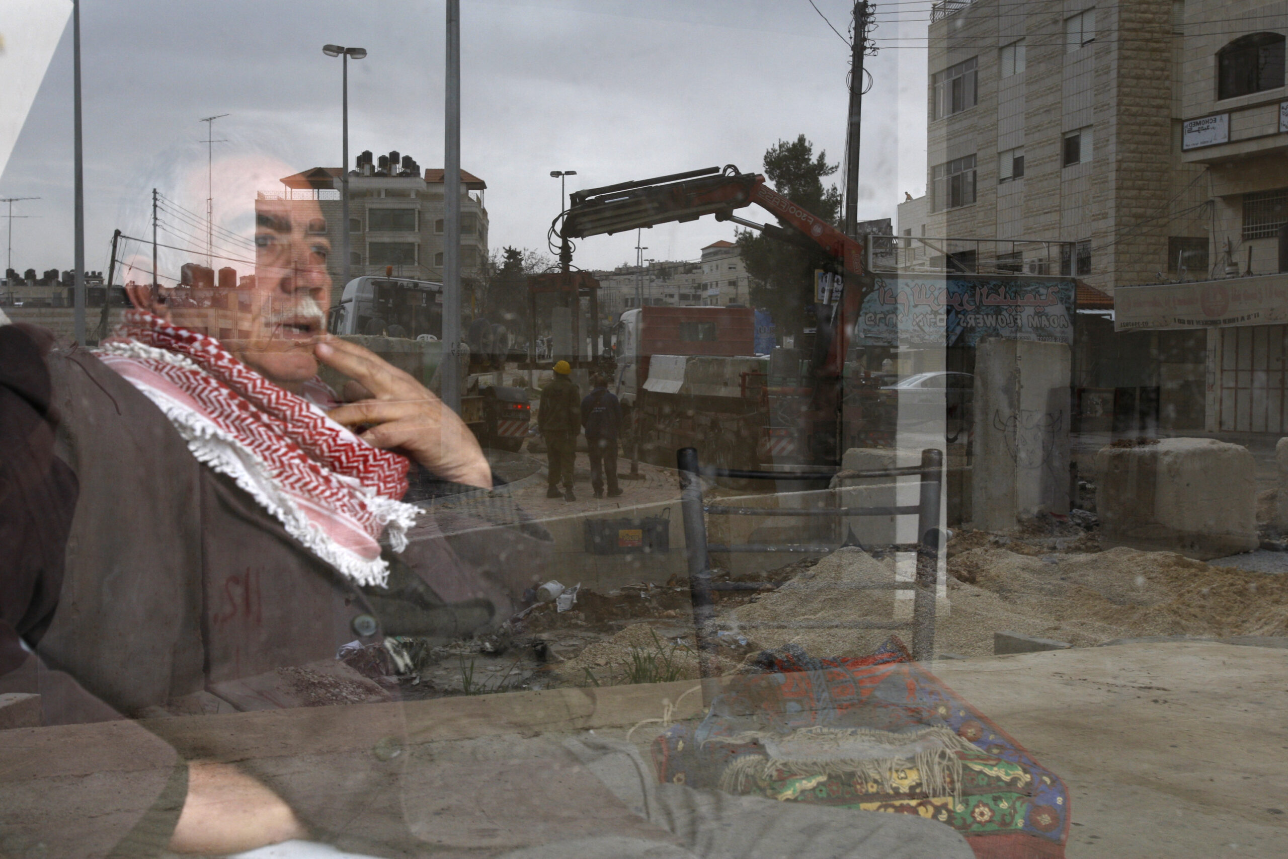Image: An Israeli Arab looks through his shop's window as Israeli soldiers remove a checkpoint in Beit Hanina, on the edge of Jerusalem February 19, 2009. REUTERS/Baz Ratner (JERUSALEM)