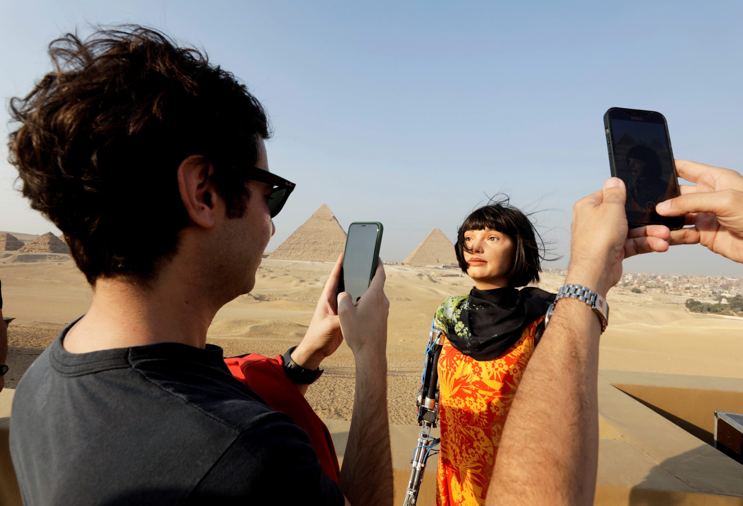 Image: Visitors take photos of AI Robot Artist 'Ai Da' at the Great Pyramids of Giza, where she exhibits her sculpture during an international art show, on the outskirt of Cairo, Egypt, October 23, 2021. REUTERS/Mohamed Abd El Ghany