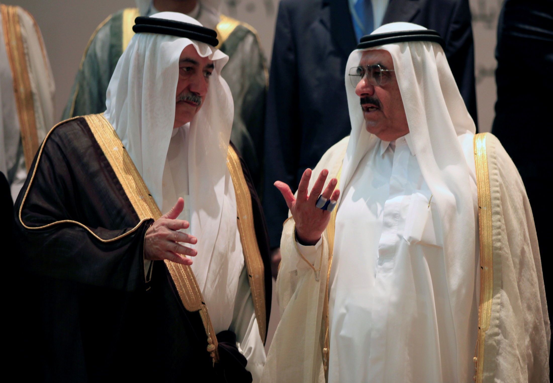 Image: UAE Finance Minister and Deputy Ruler of Dubai Sheikh Hamdan bin Rashid Al Maktoum (R) speaks to Saudi Arabia's Finance Minister Ibrahim al-Assaf ahead of a group meeting of Gulf and Arab Finance Ministers in Abu Dhabi, United Arab Emirates, September 7, 2011. REUTERS/Jumana El Heloueh/File Photo