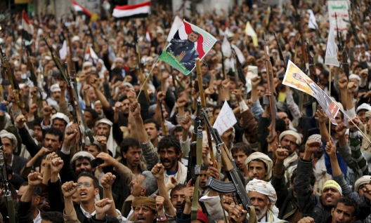 Image: Photo: Shi'ite Muslim rebels hold up their weapons during a rally against air strikes in Sanaa March 26, 2015. (Reuters/Khaled Abdullah)