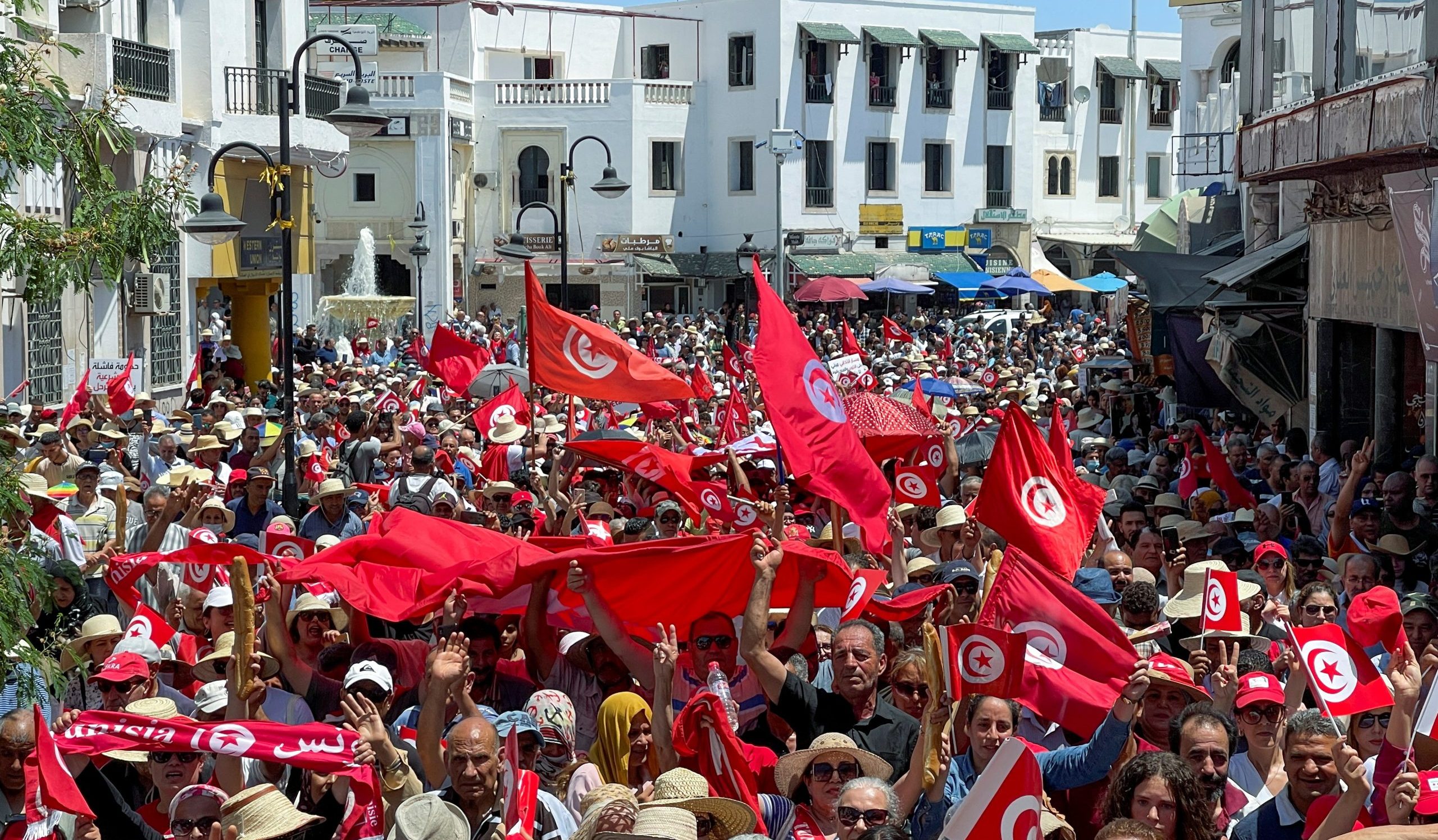 Image: FILE PHOTO: Demonstrators hold flags as they gather during a protest in opposition to a referendum on a new constitution called by President Kais Saied, in Tunis, Tunisia June 18, 2022. REUTERS/Jihed Abidellaoui/File Photo