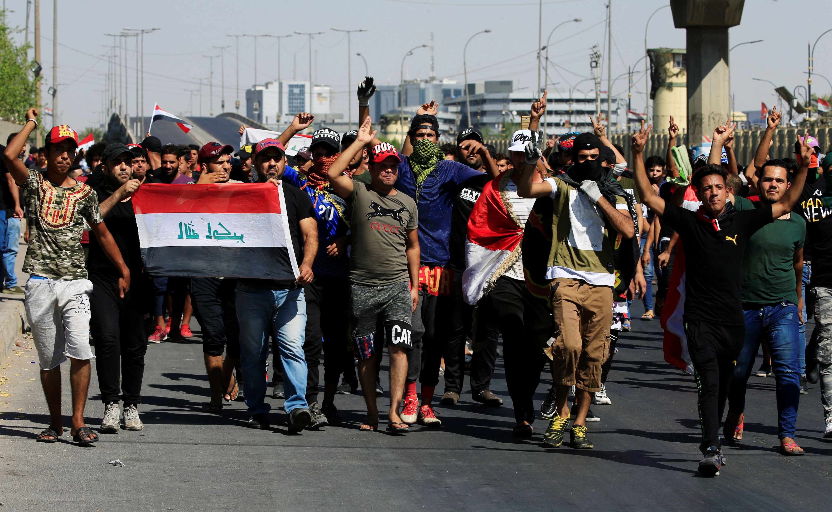 Image: Demonstrators gesture at a protest during a curfew, three days after the nationwide anti-government protests turned violent, in Baghdad, Iraq October 4, 2019. REUTERS/Alaa al-Marjani