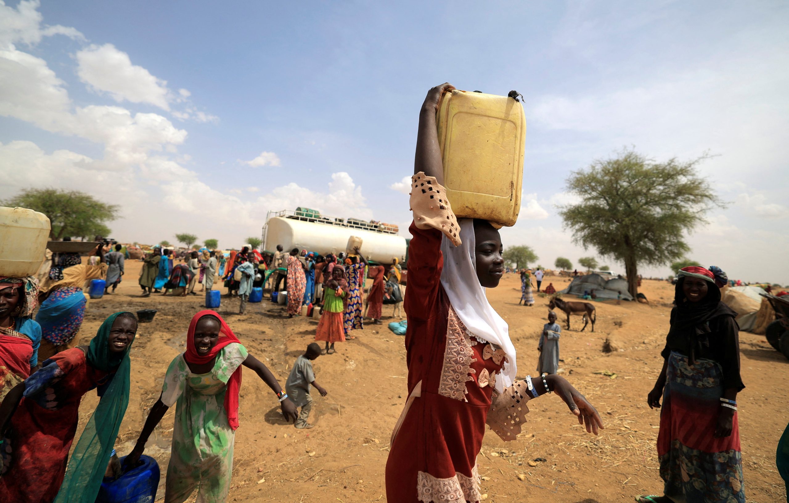 Image: A Sudanese refugee woman who fled the violence in Sudan's Darfur region carries a jerrycan of water as she walks to her makeshift shelter near the border between Sudan and Chad in Koufroun, Chad May 10, 2023. REUTERS/Zohra Bensemra