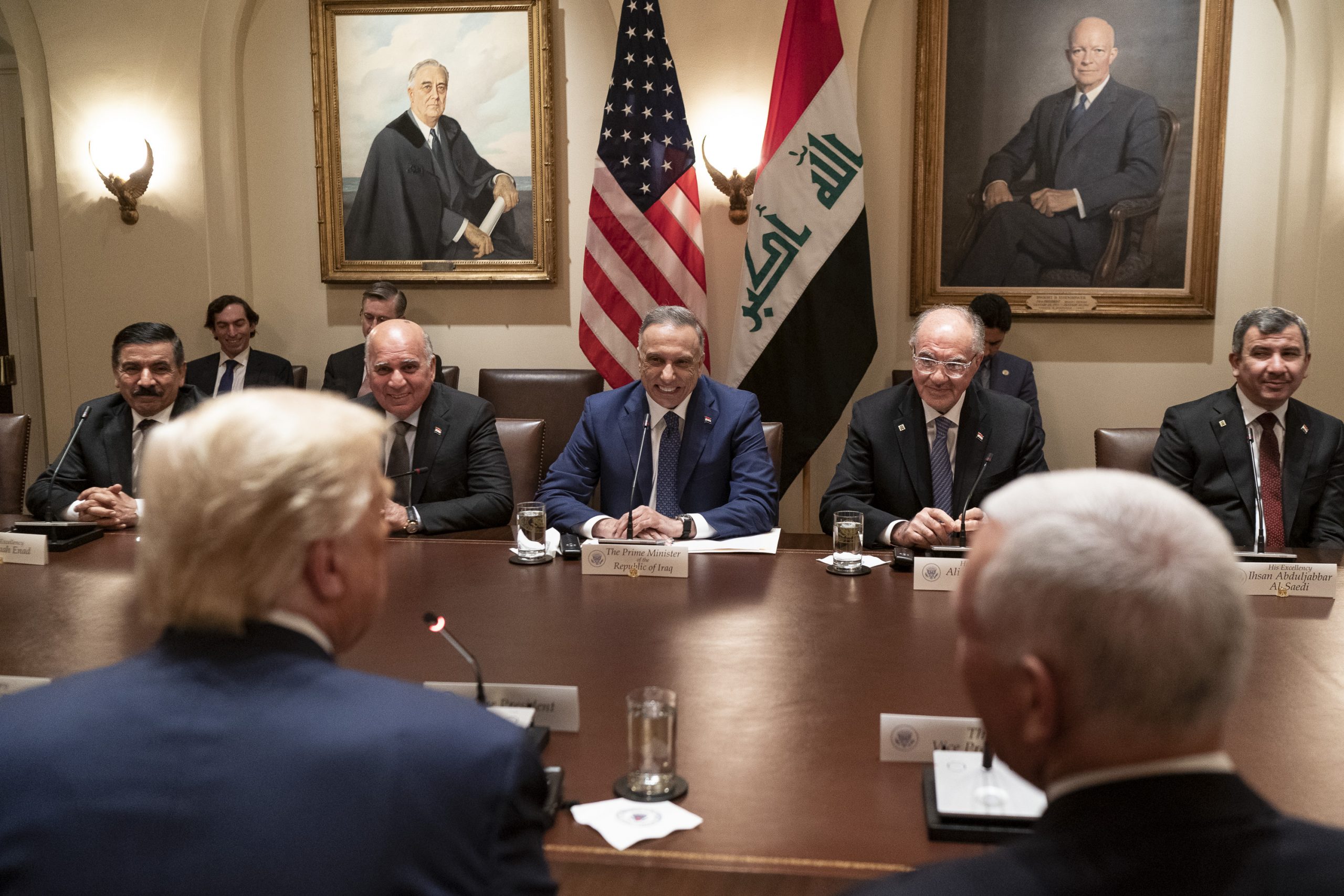 Image: President Donald J. Trump, joined by Vice President Mike Pence and members of his Cabinet, participates in an expanded bilateral meeting with Prime Minister Mustafa Al-Kadhimi of the Republic Iraq Thursday, Aug. 20, 2020, in the Cabinet Room of the White House.