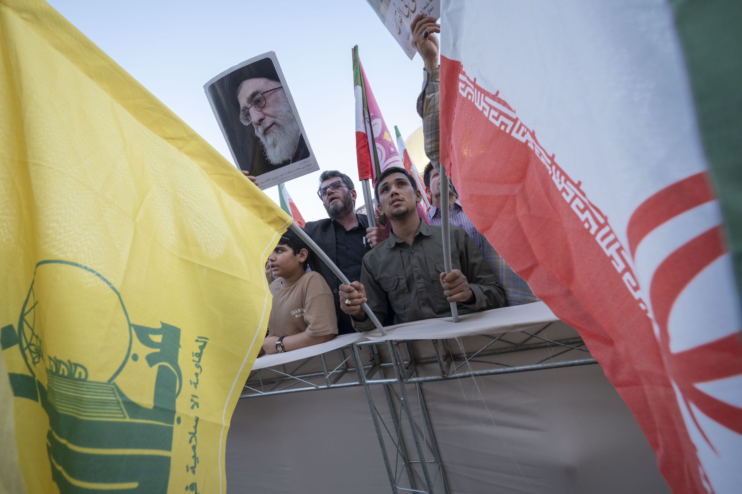Image: Iranian men hold the flag of Lebanon's Hezbollah, a flag of Iran, and a portrait of Iran's Supreme Leader, Ayatollah Ali Khamenei, during a religious rally called the 10km party to condemn Israeli attacks on Iran, in downtown Tehran, Iran, on June 14, 2025. (Photo by Morteza Nikoubazl/NurPhoto)NO USE FRANCE