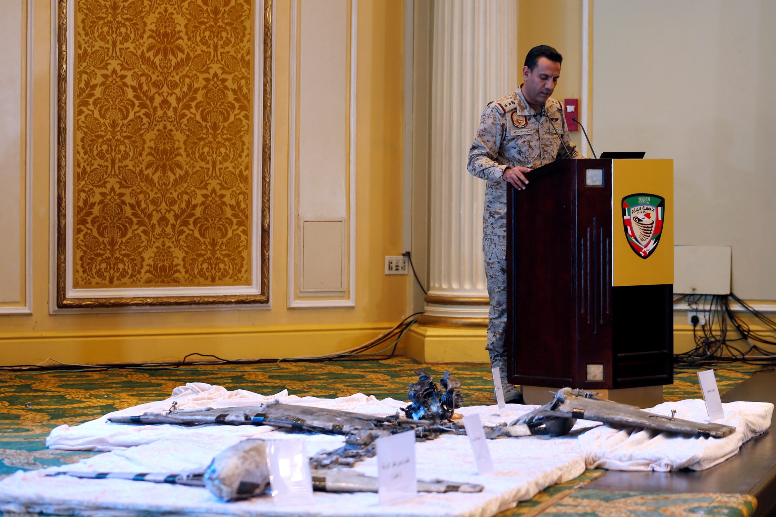 Image: Saudi-led coalition spokesman, Colonel Turki al-Malki, speaks, as he displays Iran-aligned Houthi drones, brought down April 11, over Jizan and Abha, during a news conference in Khobar, Saudi Arabia April 16, 2018. REUTERS/Hamad I Mohammed