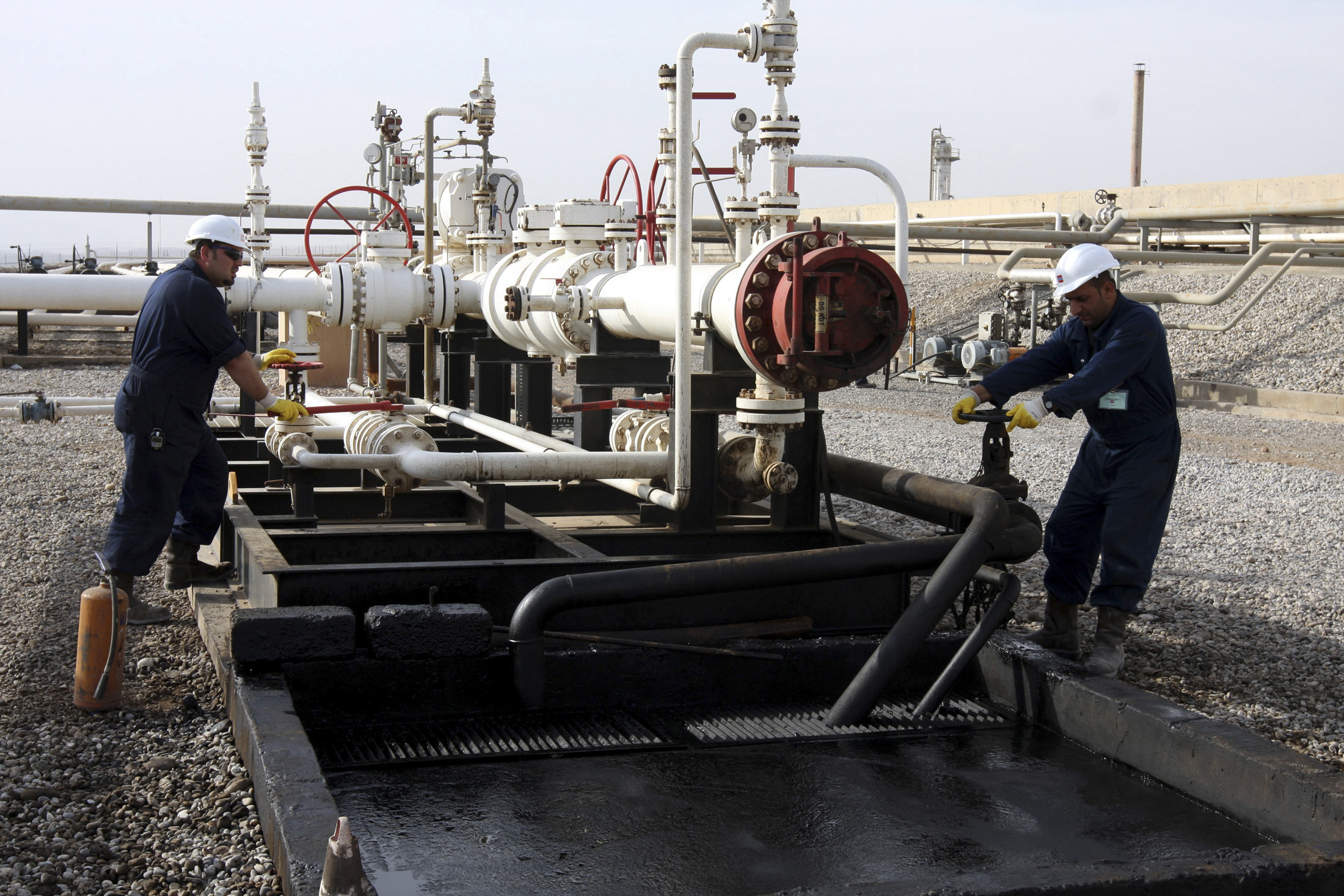 Image: Workers adjust a valve of an oil pipe in Tawke oil field near Dahuk, 400 km (249 miles) north of Baghdad, November 24, 2010. In this part of Iraq, the hillsides sweat oil. Without any coaxing, the sticky black treasure oozes from the layered rock and gathers in pools that bubble as dissolved gases surface. Gradually, as the crude slips down the hillsides, it solidifies into a grey mass that resembles a hardened lava flow. It's a good metaphor for the progress of oil from the semi-autonomous Iraqi region of Kurdistan over the past five years: big on promise, small on delivery. Picture taken November 24, 2010. To match Special Report KURDISTAN/OIL REUTERS/Azad Lashkari/Files (IRAQ - Tags: ENERGY BUSINESS)