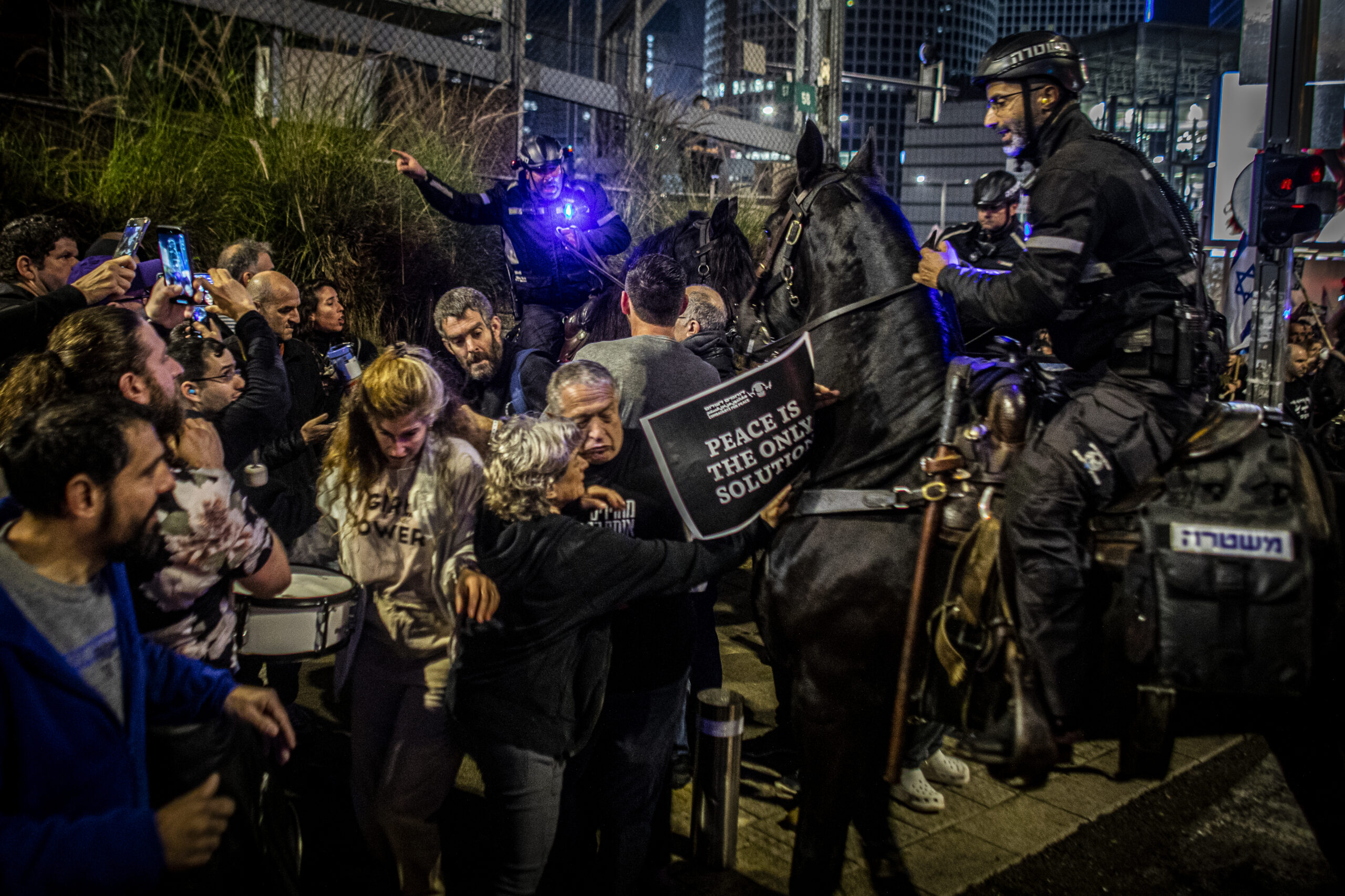 On the evening of February 24, when thousands of Israelis gathered in Tel Aviv and demanded the release of the hostages and a date for elections, Lana Grichevsky—a released hostage whose boyfriend, Matan Zangauker, remains in Hamas captivity—was hit in the face by police water cannons. Other protestors were pushed back by mounted police, were shoved violently on the ground, and suffered what many Israeli journalists described as excessive use of force by the police. It resembled many of the violent incidents during the protests against the so-called “judicial reform” promoted by Prime Minister Benjamin Netanyahu’s government during 2023.