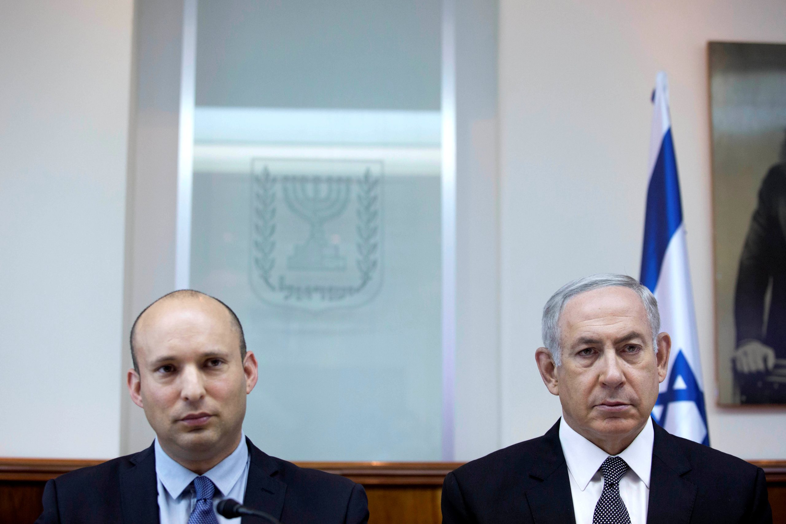 Image: Israeli Prime Minister Benjamin Netanyahu (R) sits next to Education Minister Naftali Bennett during the weekly cabinet meeting at his office in Jerusalem, 30 August 2016. REUTERS/Abir Sultan/Pool