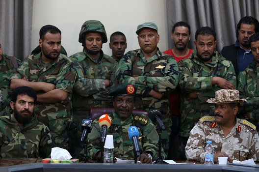 Image: Libyan Army Special Forces Commander Wanis Bukhamada (front C) delivers a statement in Benghazi May 19, 2014. Bukhamada has allied with renegade general Khalifa Haftar in his campaign against militant Islamists, highlighting the failure of central government in Tripoli to assert its authority. (Photo: REUTERS/Esam Omran Al-Fetori)