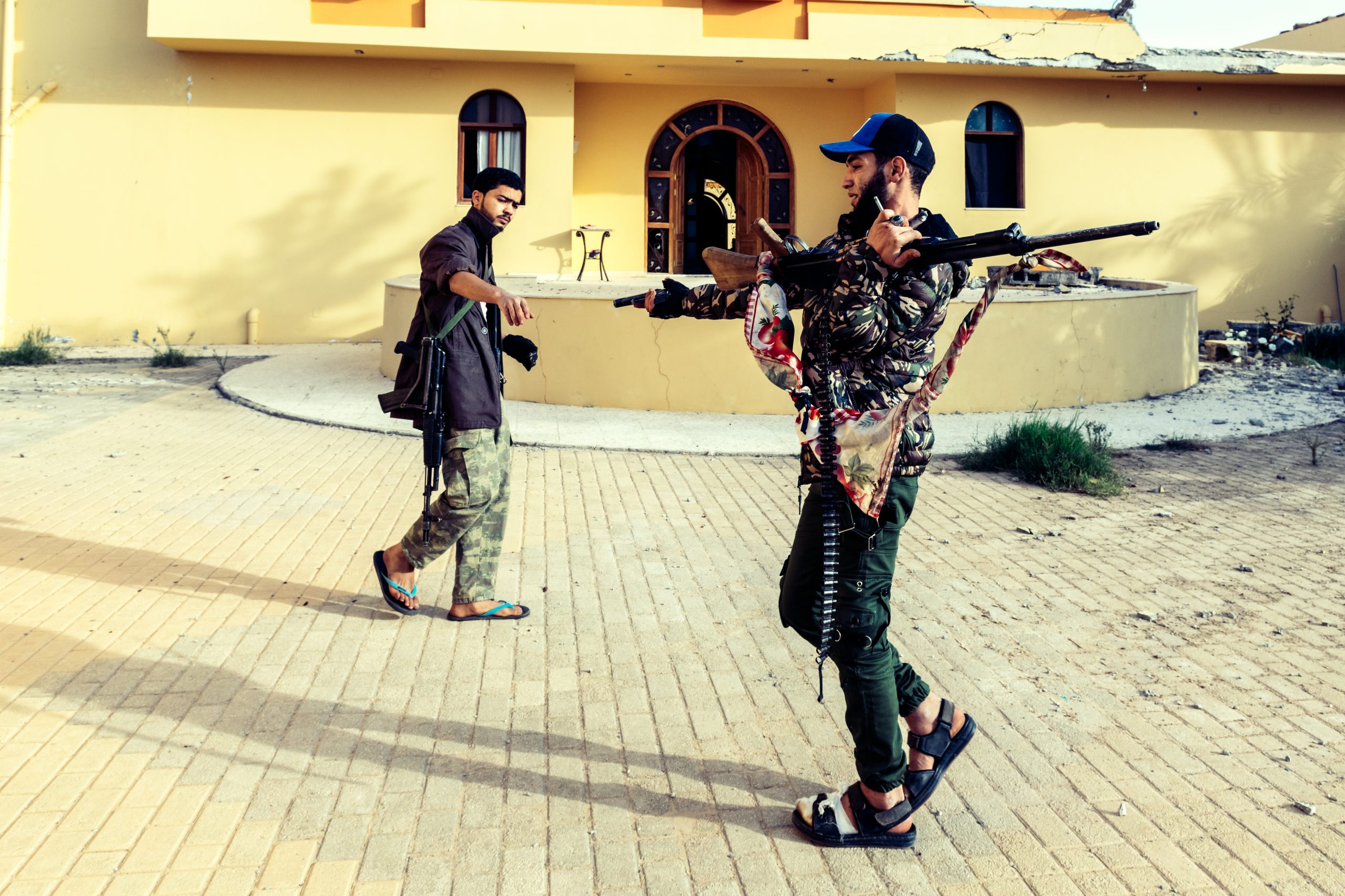 Image: On the front line of Al Swani during the battle, two fighters of the 610 Brigade (GNA) are passing a revolver from hand to hand. Since April, the Libyan National Army (LNA) led by Khalifa Haftar is attempting to take control of Tripoli defended by the forces of UN-backed recognised Government of National Accord of Fayez el-Sarraj (GNA). Libya, outskirts of Tripoli, December 6, 2019. Sur la ligne de front de Al Swani pendant les combats, deux combattants de la brigade 610 (GAN) se passe un revolver de la main a la main. Depuis avril, l'armee nationale Libyenne (LNA) dirigee par Khalifa Haftar essaie de prendre le control de Tripoli defendu par les forces du gouvernement d'accord national de Fayez al-Sarraj, soutenu par l'onu (GAN). Libye, banlieue de Tripoli, 6 decembre 2019.NO USE FRANCE