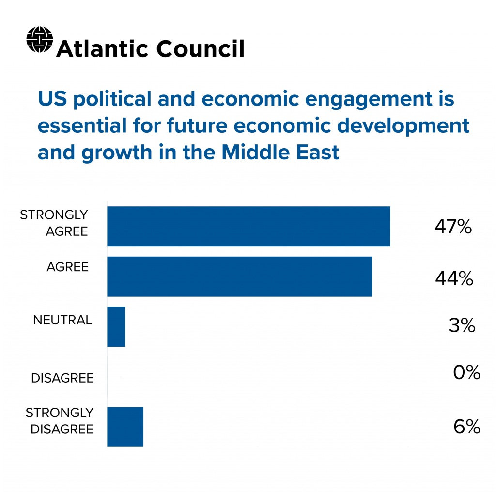 - 91 percent of survey respondents agree that US political and economic engagement is essential for future economic development and growth in the Middle East. This should be a glaring beacon to a next administration that the international business community at home and in the region desires the United States to remain at the table on issues of policy and fiscal and financial matters. However, this is not a statement on the US military presence in the region.