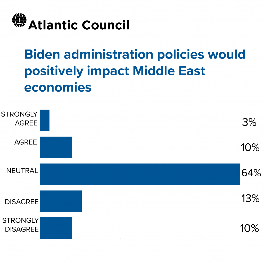 The most striking results from this survey are the large numbers – pluralities and in some cases large majorities – that view Trump policies as hurtful to regional economies. This contrasts with the widespread perception in the United States that conservative Arab states prefer Trump because of his “maximum pressure” campaign against Iran. Instead, it appears that most top business people in the region see sanctions and rising military tensions – as well as perhaps Trump’s mishandling of the COVID crisis – as negative for business and economic growth. They may not be thrilled by the idea of a Biden presidency but there will be few regrets, at least from a business perspective, to see the back of Trump.