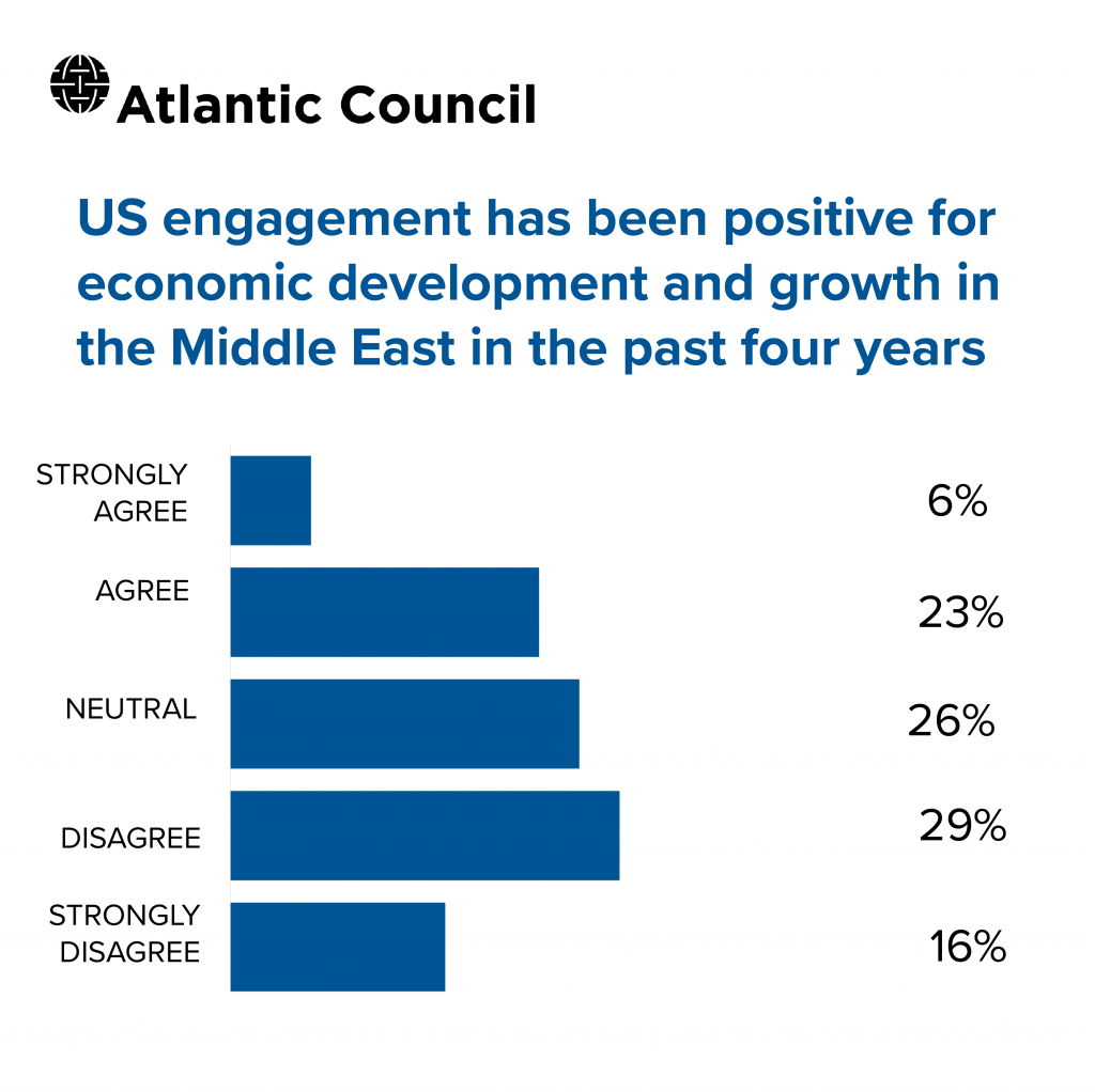 - Only 29 percent of survey respondents agreed that US engagement has been positive for economic development and growth in the Middle East in the past four years. This is tied to President Trump’s impact globally, which has been negative. Sparking trade wars with China has negatively impacted the region since it is a trading hub. Sanctions, overall uncertainties, and pulling out of agreements also impacted trade. In addition, the energy issue seems very transactional now. Though you would think that regional business leaders would see Trump’s support of Gulf leaders (against Iran) as positive, the reality is that people in region do business with Iran, so it may be seen as the pendulum swinging too far in one direction.