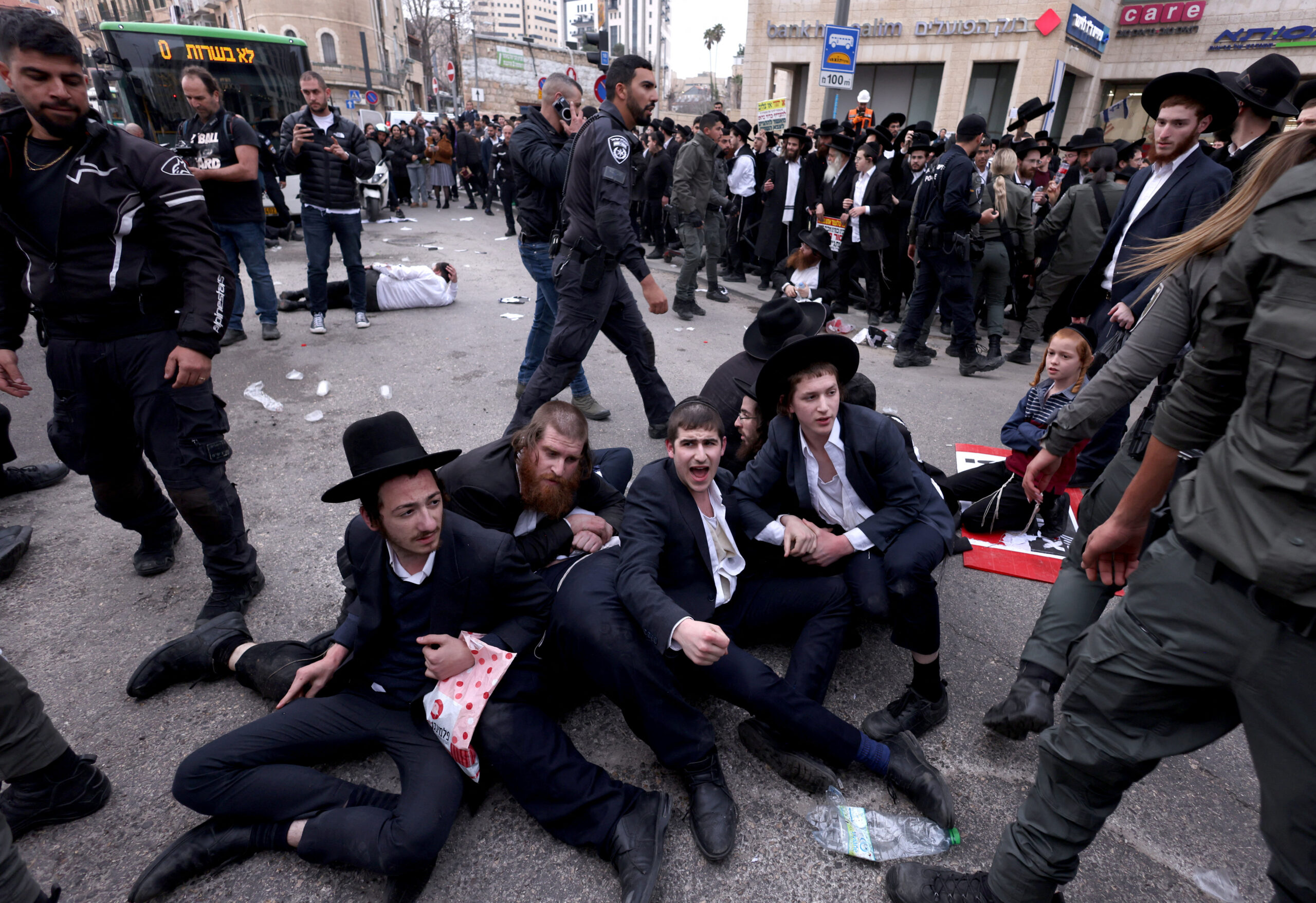 Image: Ultra-Orthodox Jewish men protest against attempts to change government policy that grants ultra-Orthodox Jews exemptions from military conscription in Jerusalem February 26, 2024. REUTERS/Ronen Zvulun
