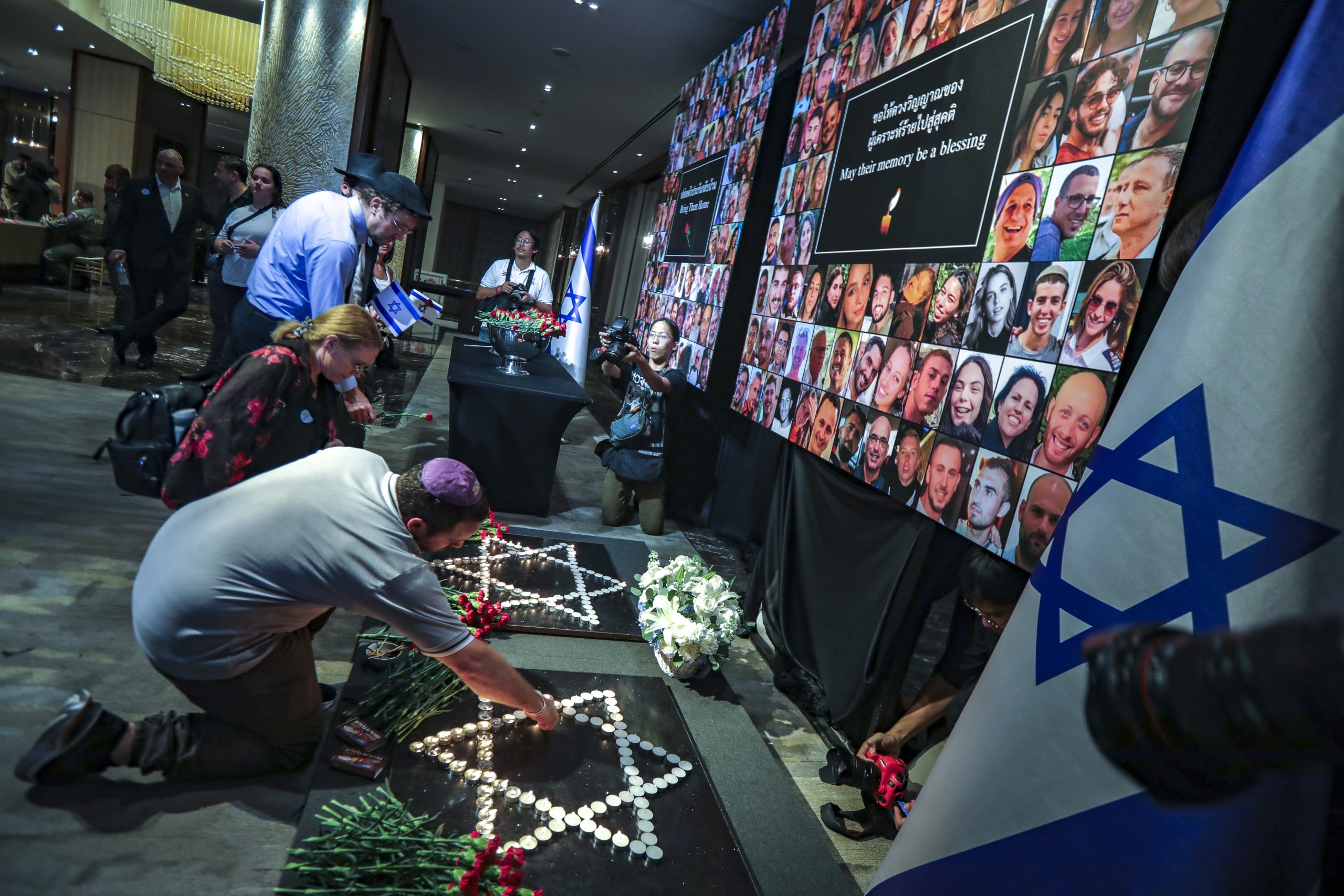 Image: People light candles forming the Star of David in front of a large printout with photos of people kidnapped by Hamas during the October 7th attack in Israel, is displayed during an event in support of Israel demanding the release of all hostages, Thailand, October 24 2023. The event, organized by the Israeli Embassy in Bangkok, was held to honor the victims of the October 7 attack by Hamas, and to demand the release of all hostages still being held in Gaza. More than 5,000 Palestinians and 1,400 Israelis have been killed, since Hamas militants launched an attack against Israel from the Gaza Strip on 07 October, and more than 200 were kidnapped by Hamas and taken into the Gaza Strip. Matrix Images / Diego Azubel