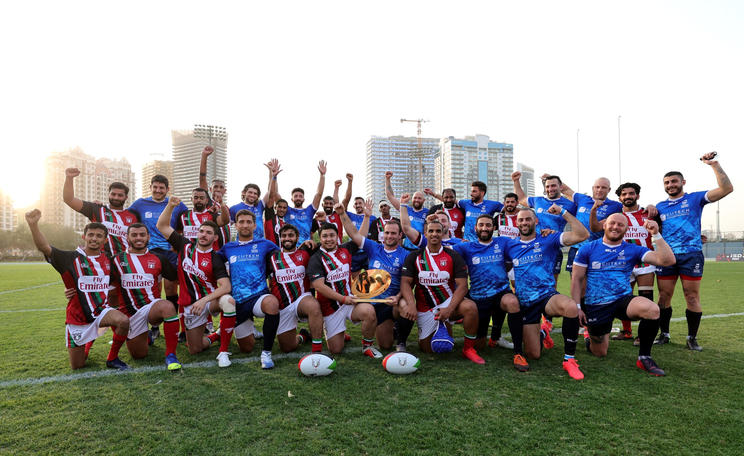 Image: Rugby Sevens - International Friendly - United Arab Emirates v Israel - Dubai Sports City, Dubai, United Arab Emirates - March 19, 2021 UAE and Israel players pose with the Abraham Accord Friendship Cup trophy REUTERS/Christopher Pike