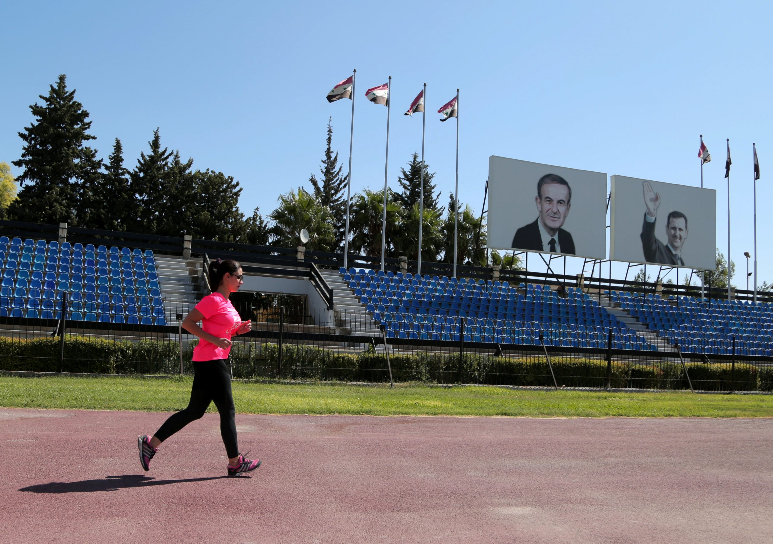 Image: Kinana al-Bunni, 37, a female taxi driver, exercises in Damascus, Syria October 3, 2020. Pictures of Syria's president Bashar al-Assad and his father late former president Hafez al-Assad, are seen in the background. Picture taken October 3, 2020. REUTERS/Yamam Al Shaar