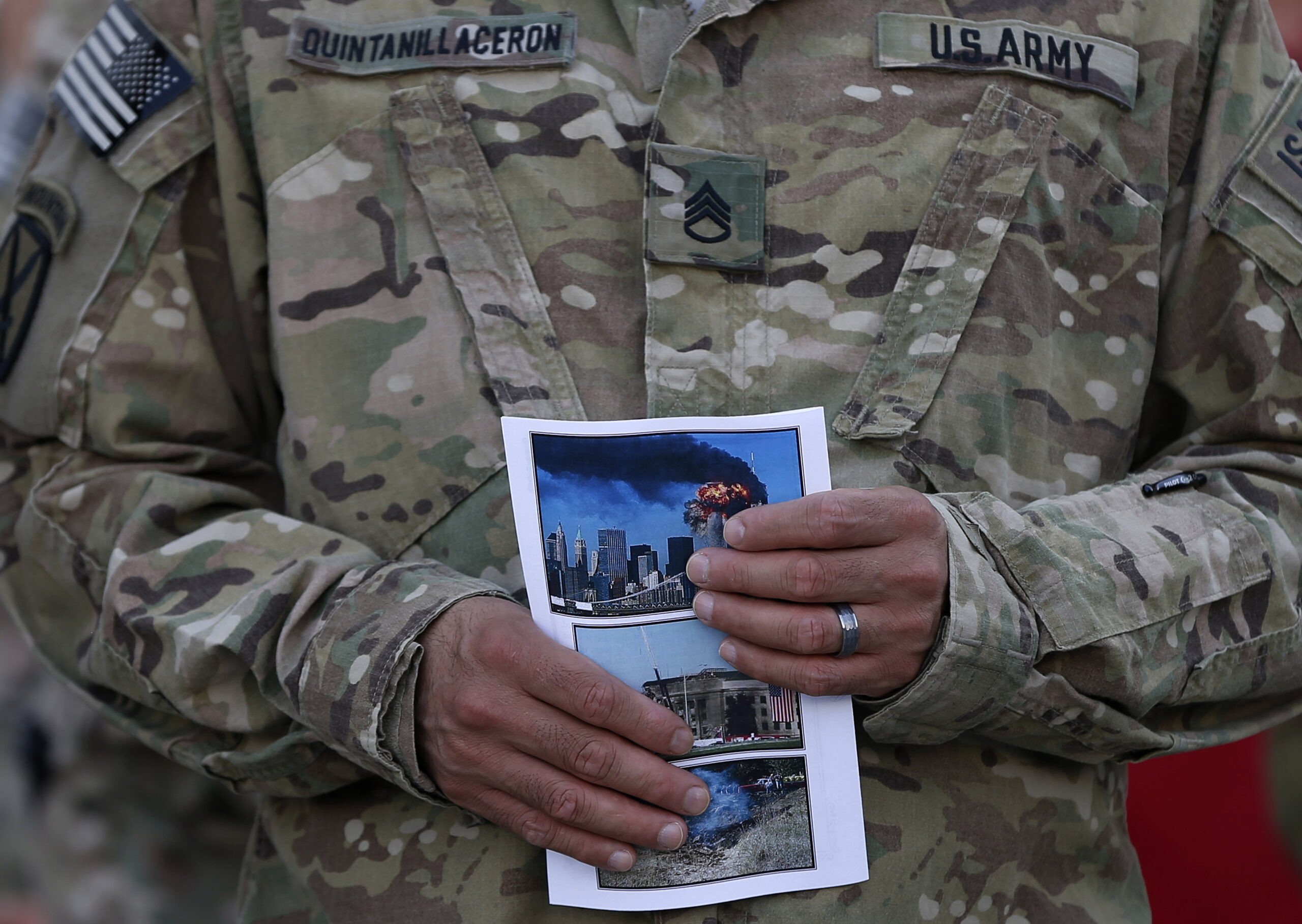 Image: A U.S. soldier holds photographs of the September 11, 2001 attacks during a ceremony marking the 13th anniversary of the September 11 attacks in the United States, at the Bagram airbase north of Kabul September 11, 2014. REUTERS/Omar Sobhani
