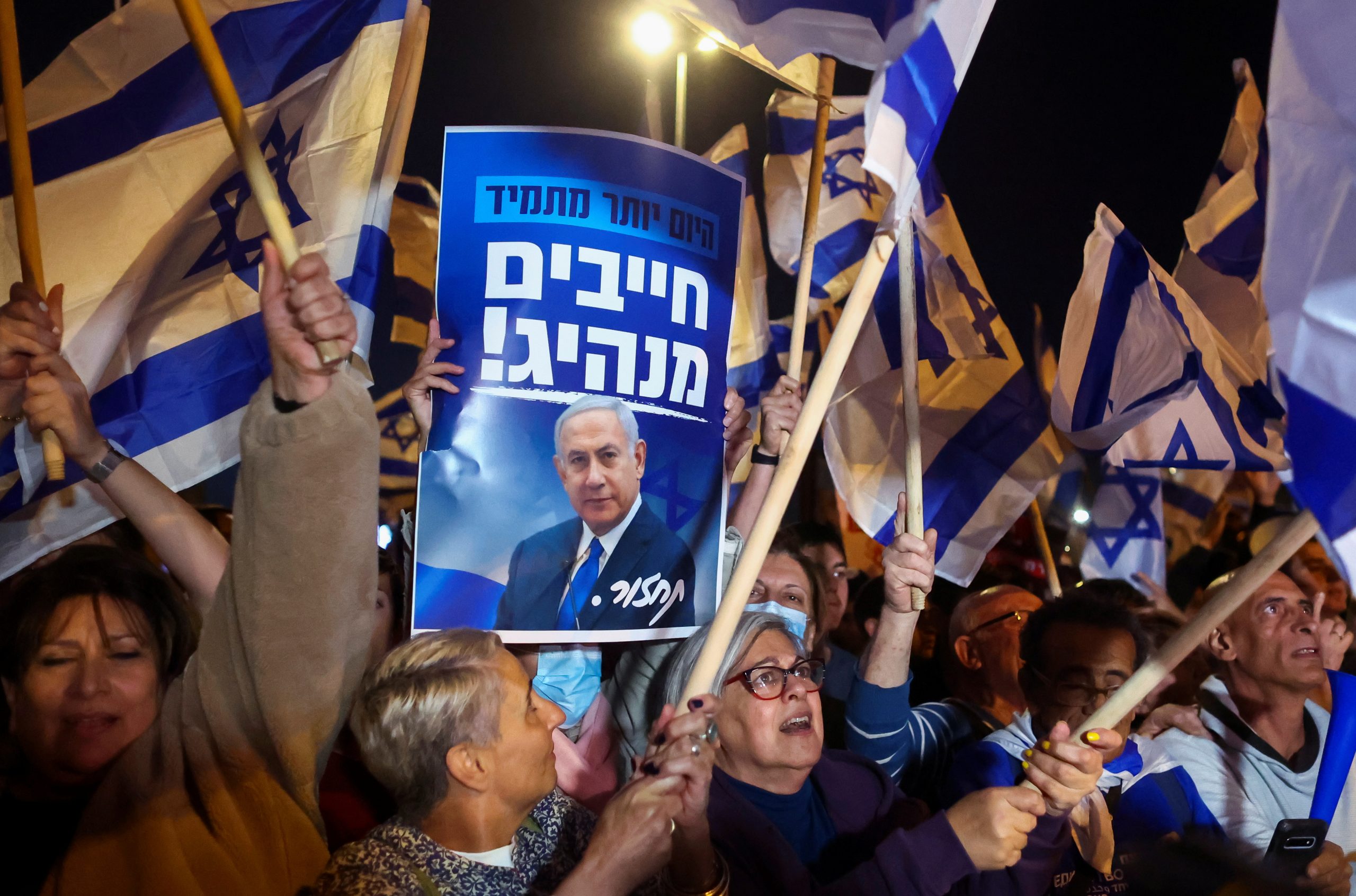 Image: A right-wing Israeli activist holds up a poster with an image of Former Prime Minister Benjamin Netanyahu while others wave Israeli national flags during a rally in Jerusalem, April 6, 2022. REUTERS/Ronen Zvulun