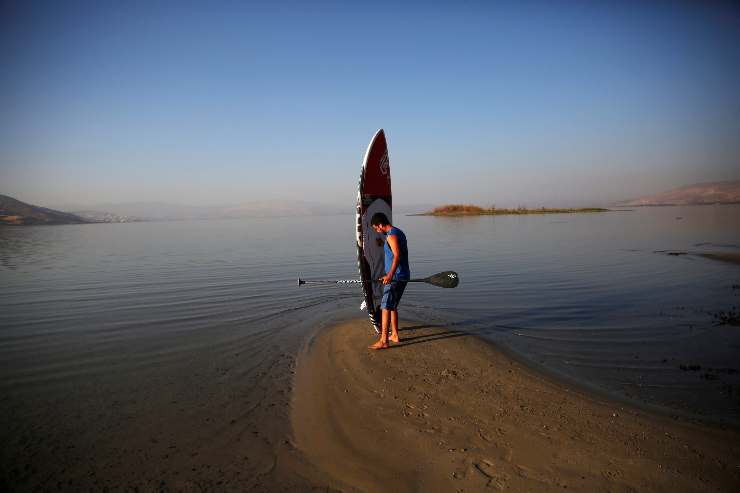Image: Yotam Steinberg from Kibbutz Maagan holds his stand-up paddle board as he enters the Sea of Galilee, northern Israel November 8, 2016. REUTERS/Ronen Zvulun