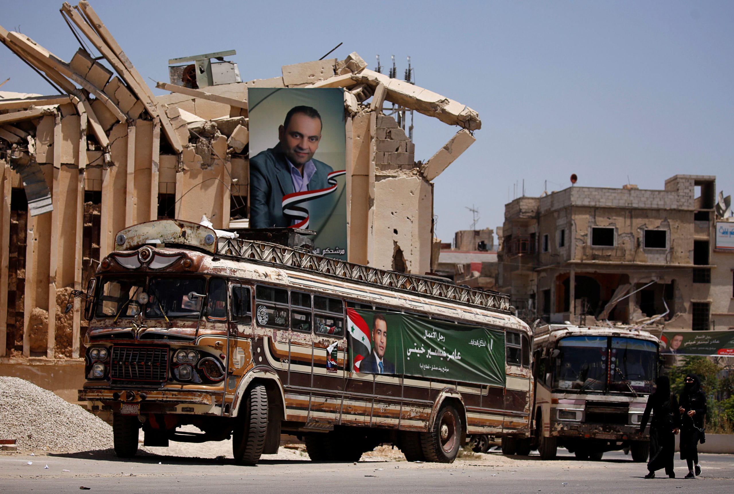 Image: Women walk near banners for parliamentary election candidates in Douma, in the eastern suburbs of Damascus, Syria July 19, 2020. REUTERS/Omar Sanadiki