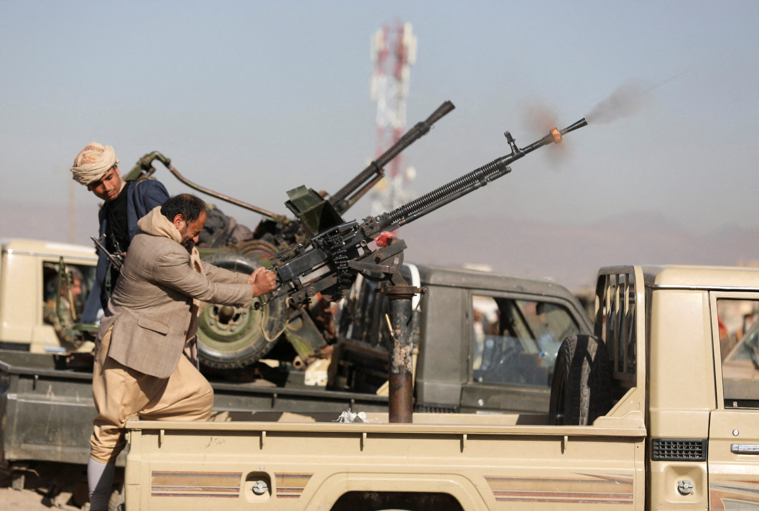 Image: Houthi-aligned armed tribesmen fire a machine gun during a gathering to show support to Palestinians in the Gaza Strip and defiance to Israel and U.S.-led coalition, in the northern outskirts of Sanaa, Yemen January 16, 2025. REUTERS/Khaled Abdullah
