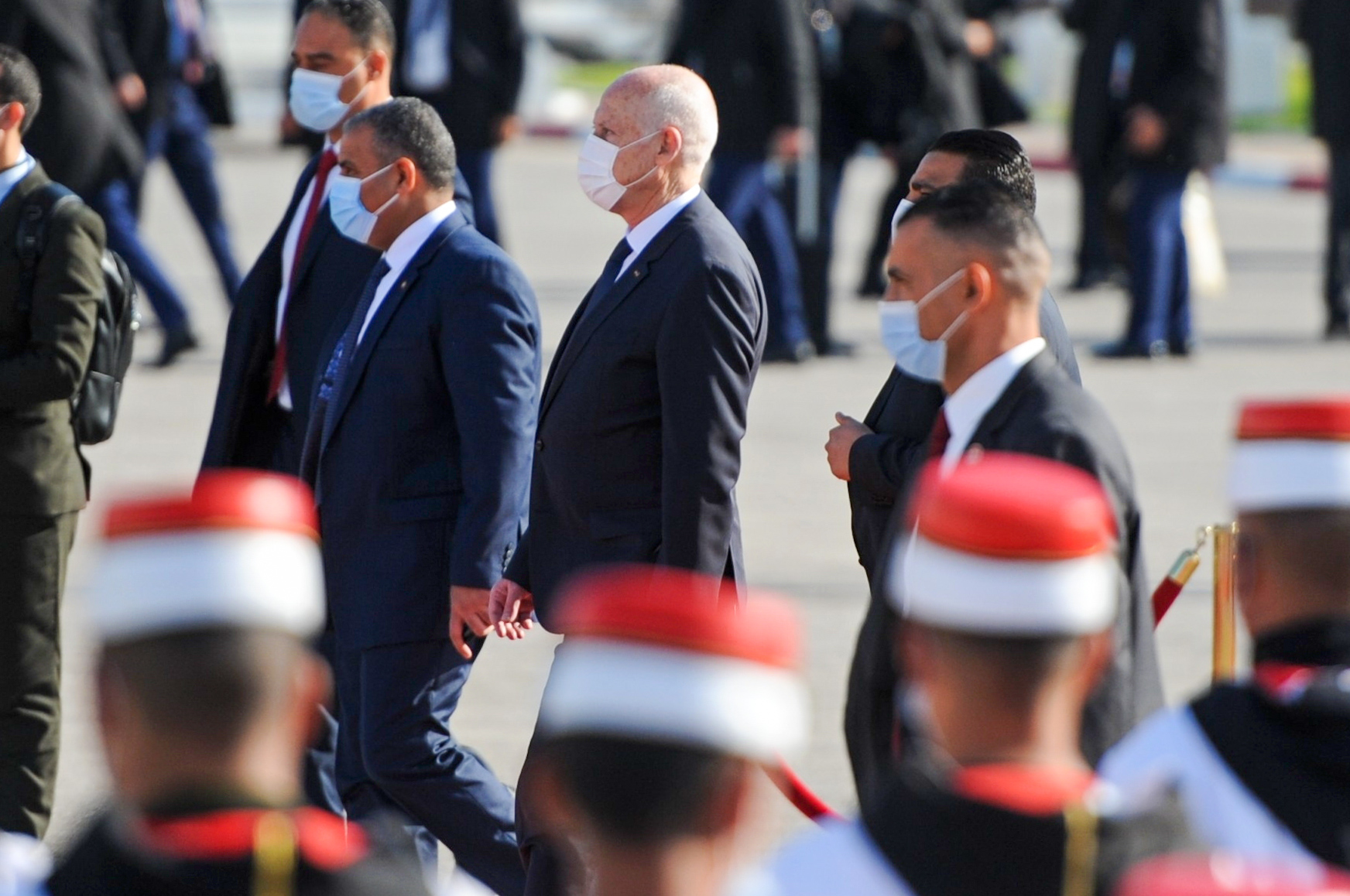 Image: Tunisian President Kas Saied during the arrive of the Algerian President Abdelmadjid Tebboune at Tunis-Carthage airport as part of their working visit to Tunisia to treat the relations of cooperation and partnership as well as to consolidate consultation and coordination between the leaders of the two countries on topical issues. On December 15, 2021 in Tunis, Tunisia. (Photo by Hasan Mrad/ Eyepix Group)