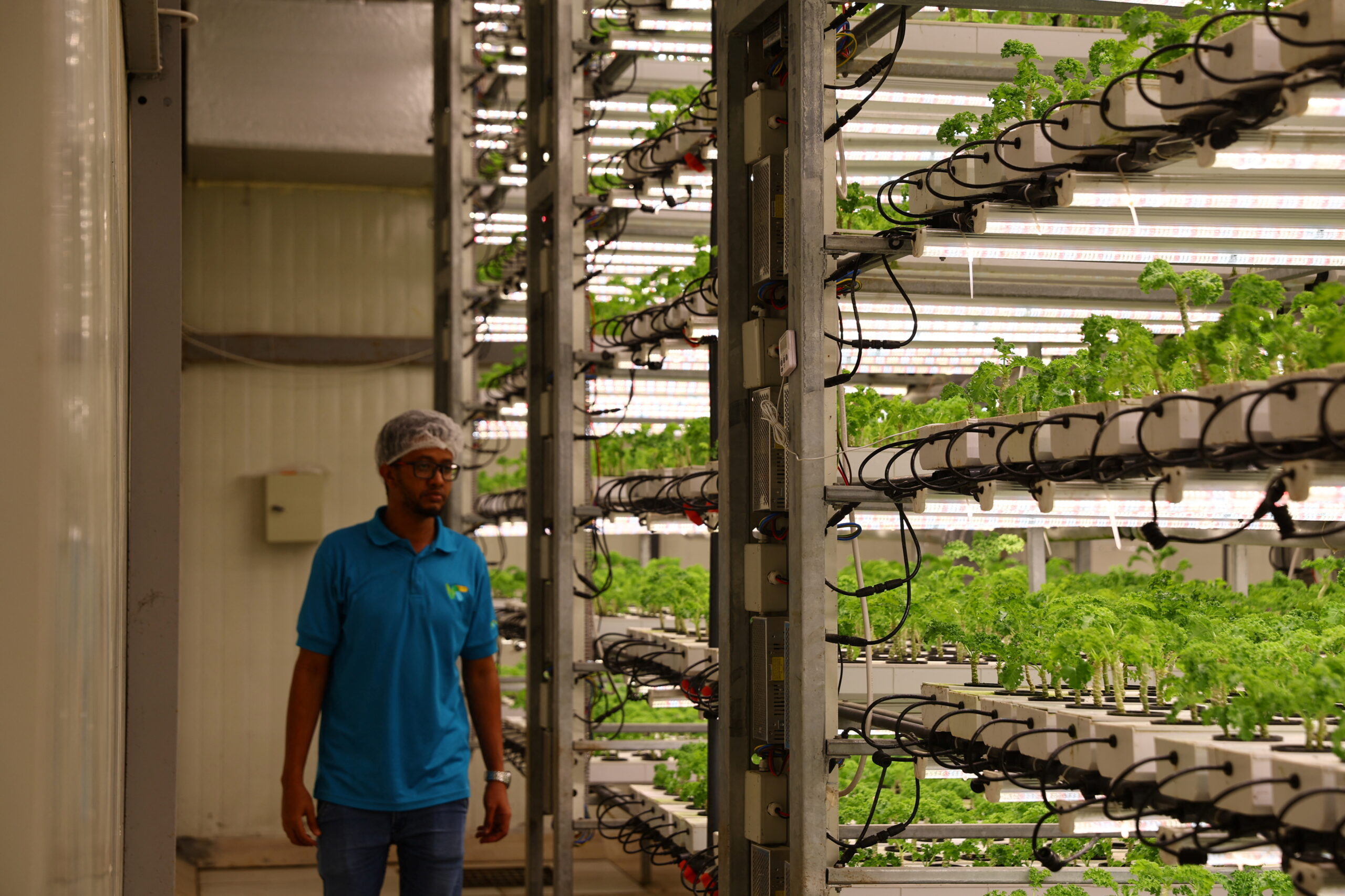 Image: A worker walks next to leafy vegetables grown at the vertical nutrient film technique (NFT) system at Veggietech, a start-up farm, that produces all year-round crops using smart and sustainable farming technologies in the middle of UAE's Sharjah desert, in Sharjah, United Arab Emirates, February 1, 2023. REUTERS/Rula Rouhana