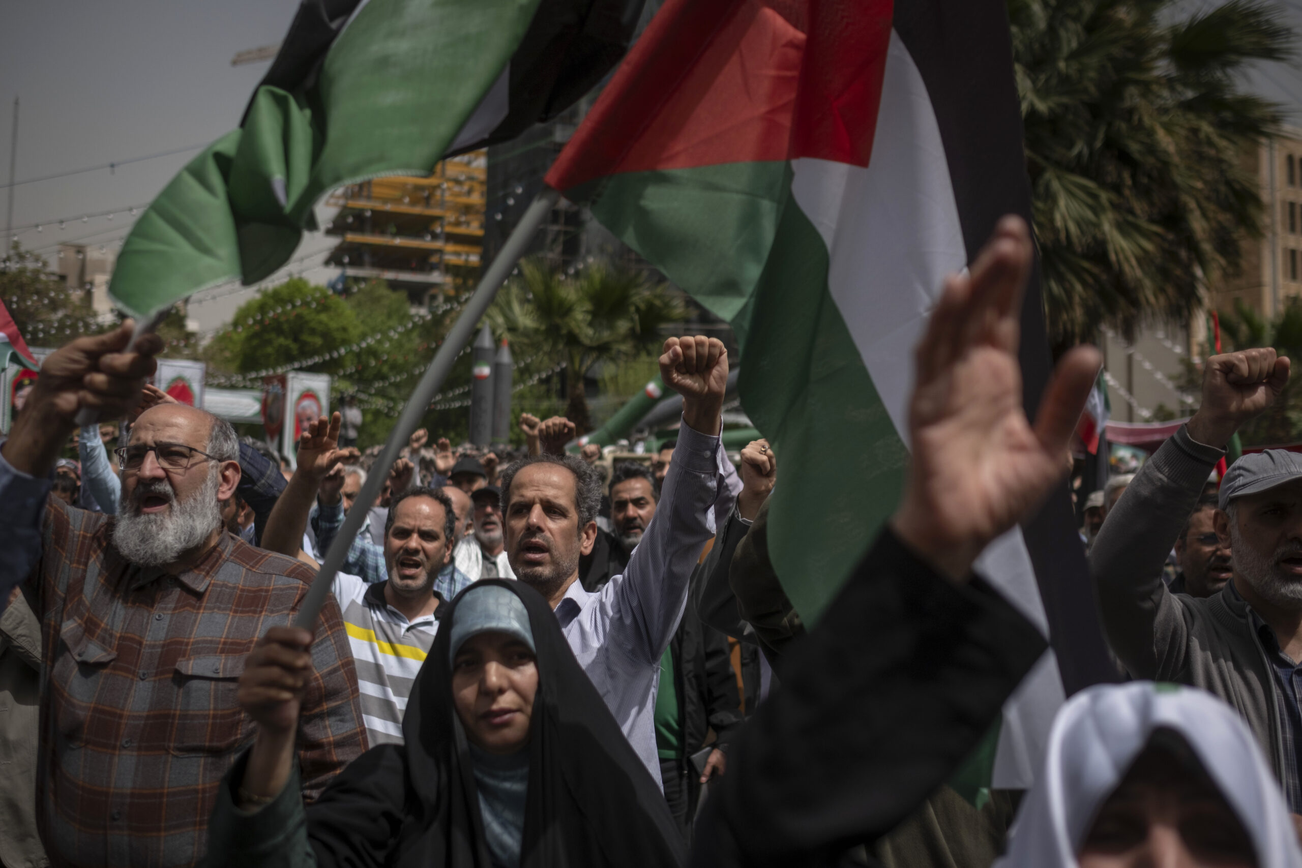 Image: Iranian protesters shout anti-Israeli and anti-U.S. slogans while participating in an anti-Israeli protest at Palestine Square in downtown Tehran, Iran, on April 9, 2025. Iranian protesters gather at Palestine Square to show their anger and protest against the new Israeli airstrikes on the city of Gaza. (Photo by Morteza Nikoubazl/NurPhoto)NO USE FRANCE
