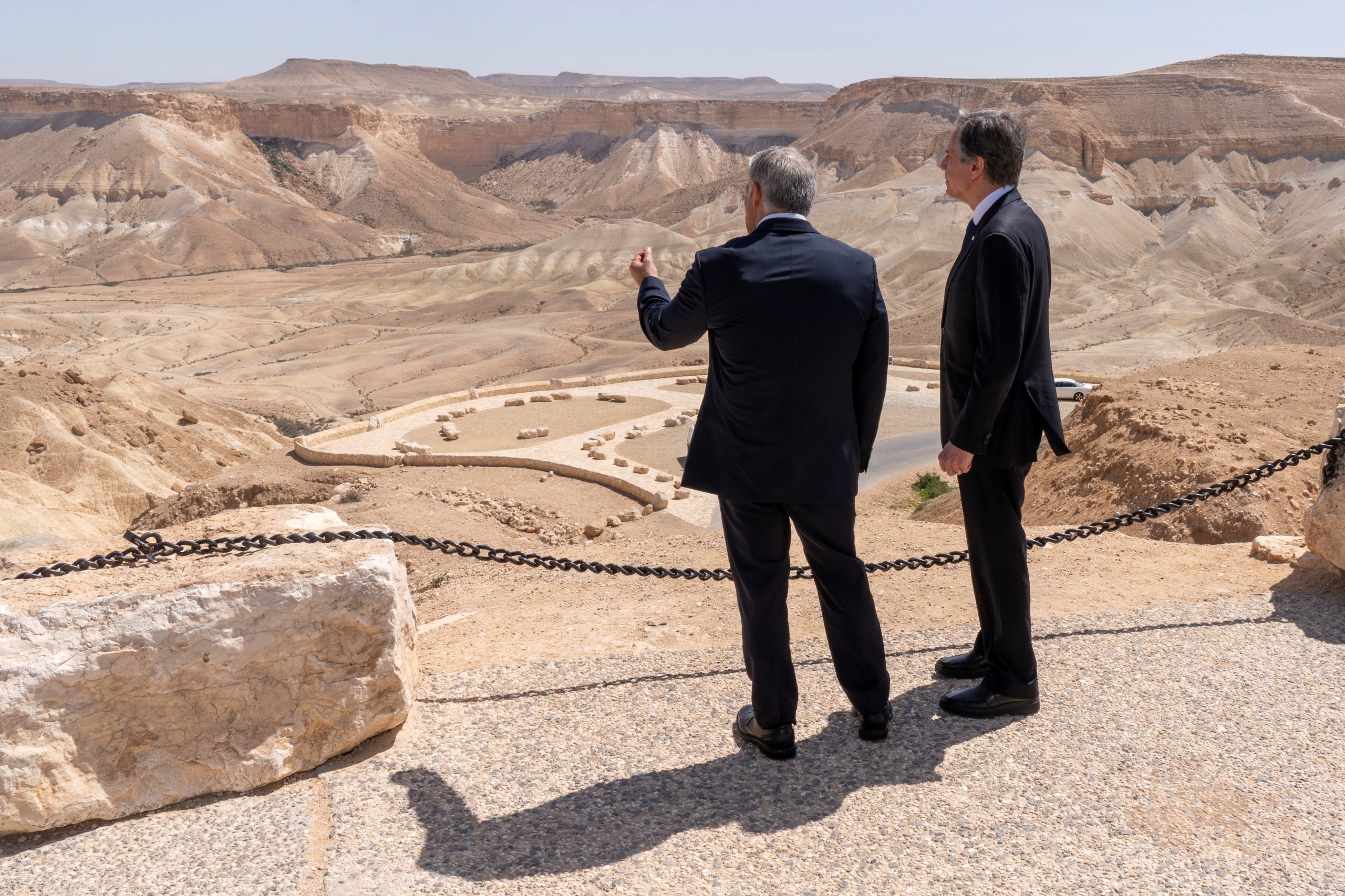 Image: Israel?s Foreign Minister Yair Lapid and U.S. Secretary of State Antony Blinken visit Ben-Gurion's Tomb National Park, near Sde Boker, Israel March 28, 2022. Jacquelyn Martin/Pool via REUTERS