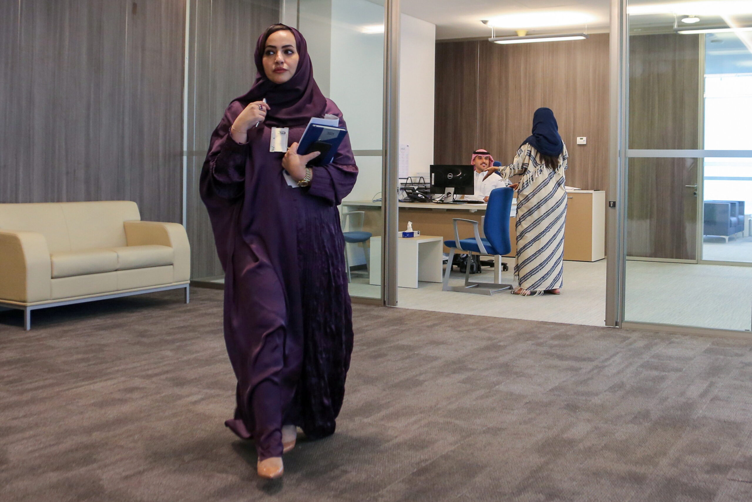 Image: Nouf al-Qahtani, Enablement Programs Manager at Saudi Human Resources Development Fund, walks in the office in Riyadh, Saudi Arabia August 19, 2021. Picture taken August 19, 2021. REUTERS/Ahmed Yosri
