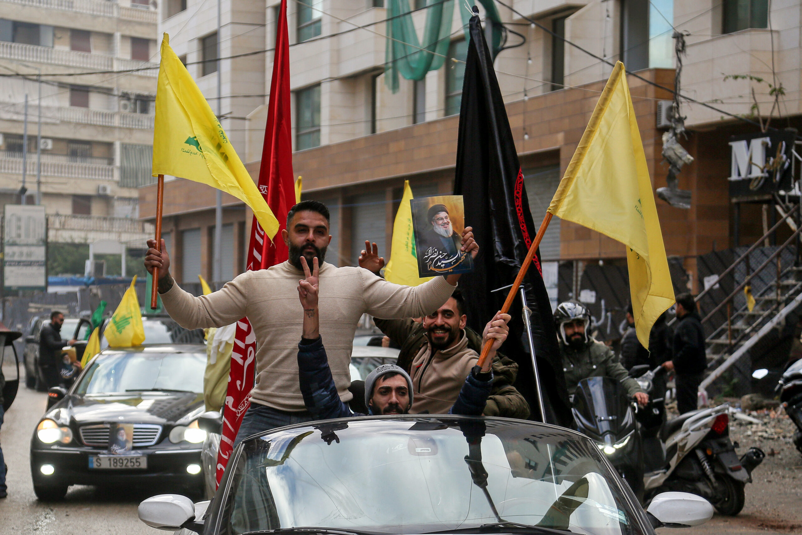 Image: Residents of Beirut southern suburb, wave the flags of pro-Iranian Hezbollah as they jubilate while return to the devastated party stronghold. A ceasefire between Israel and the Lebanese Hezbollah militia came into force in the early hours of 27 November, but it was preceded by heavy explosions in the Beirut area right up until the ceasefire start time. via Reuters