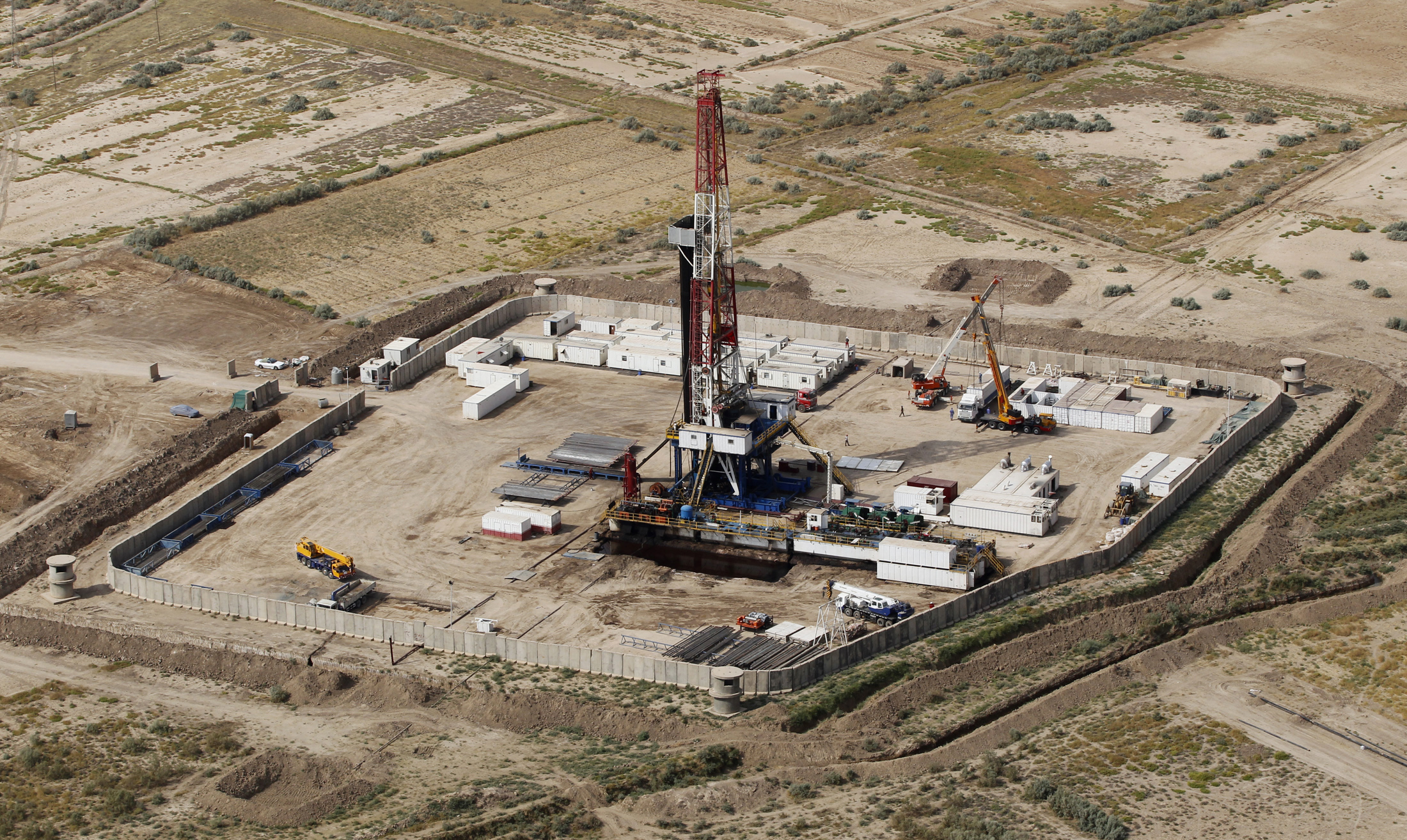 Image: An aerial view of an oil drilling rig at the al-Ahdab oil field in Wasit province September 23, 2011. Chinese company, the China National Petroleum Corporation has begun operations at the Al-Ahdab oil field in Iraq, according to news reports. Picture taken September 23, 2011. REUTERS/Mohammed Ameen (IRAQ - Tags: POLITICS ENERGY BUSINESS)