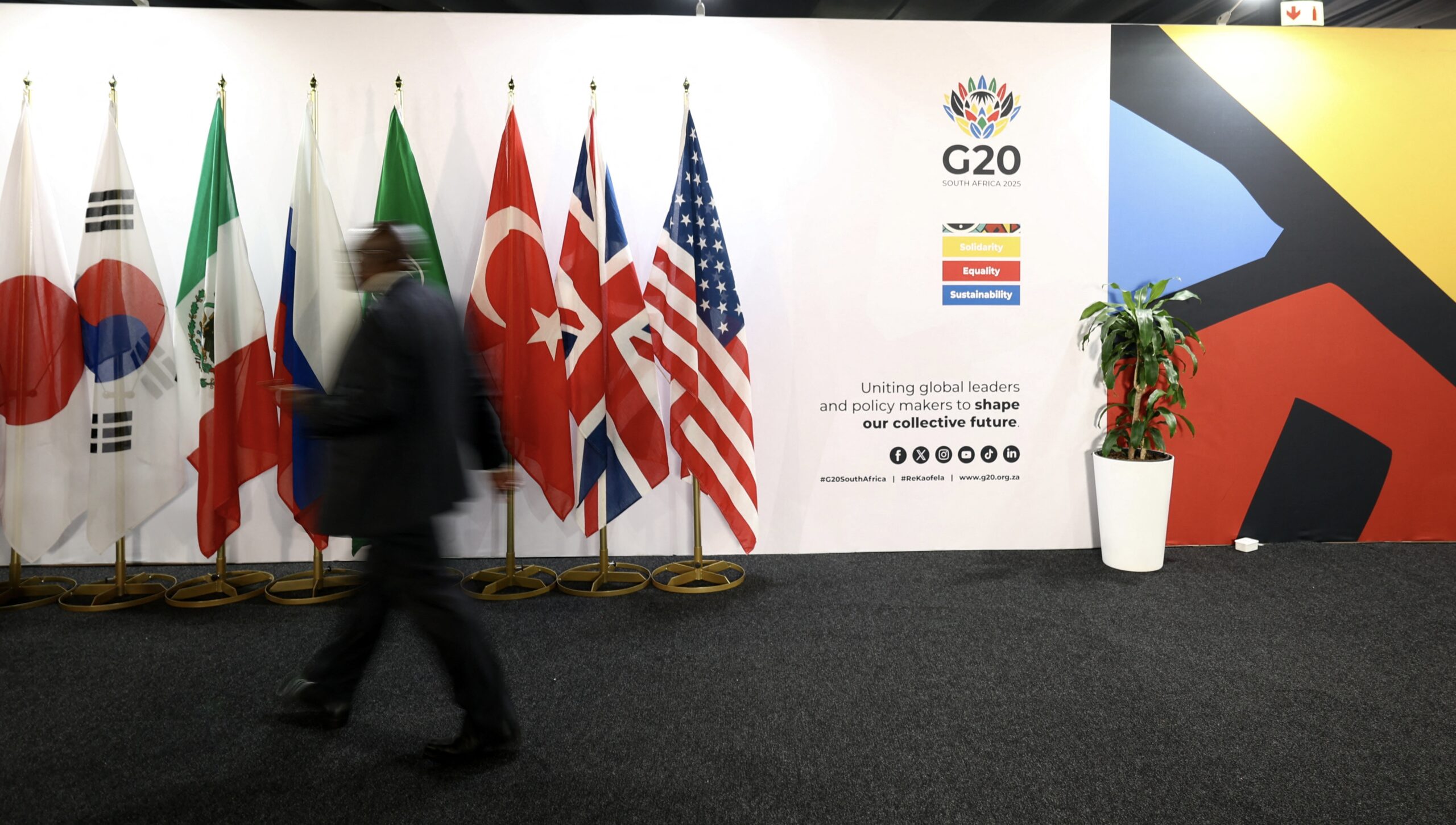Image: A person walks past flags in the media room, on the second day of the G20 Leaders' Summit in Johannesburg, South Africa, November 23, 2025. REUTERS/Yves Herman