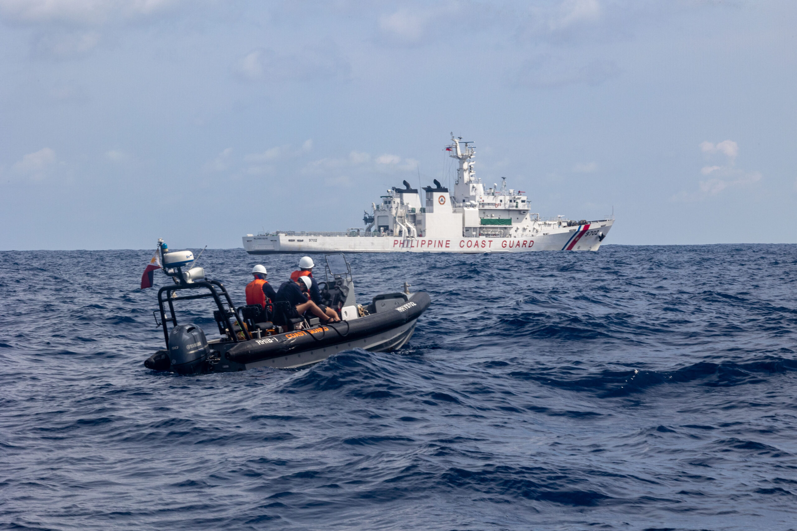 Image: Members of the Philippine Coast Guard, assigned to Philippine Coast Guard Vessel Melchora Aquino (MRRV-9702), pilot a small boat during a bilateral US-Philippine search and rescue exercise in the South China Sea, July 16, 2024. (US Marine Corps photo by Cpl. Elijah Murphy)