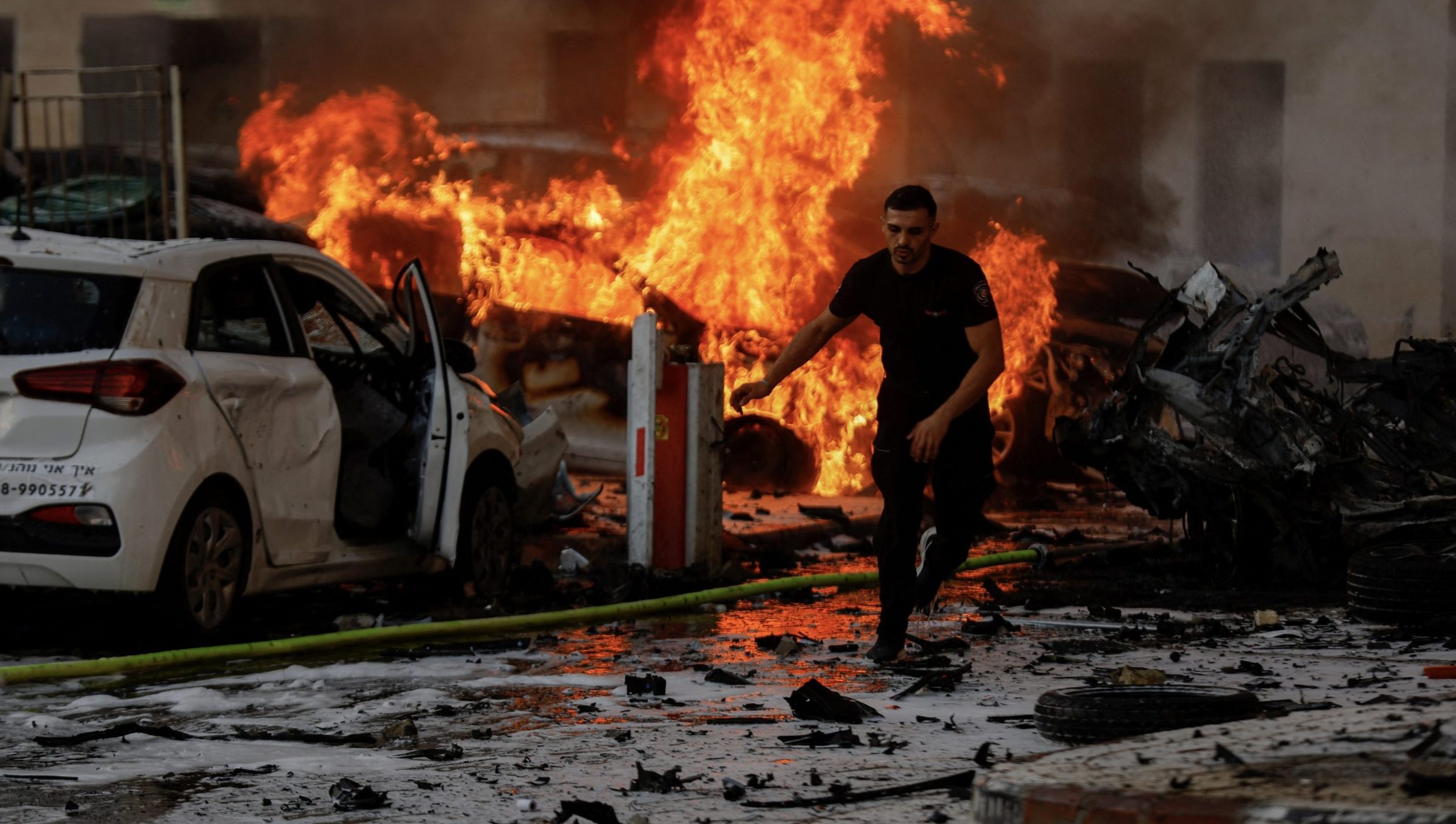 Image: A man runs on a road as fire burns after rockets were launched from the Gaza Strip, in Ashkelon, Israel October 7, 2023. REUTERS/Amir Cohen