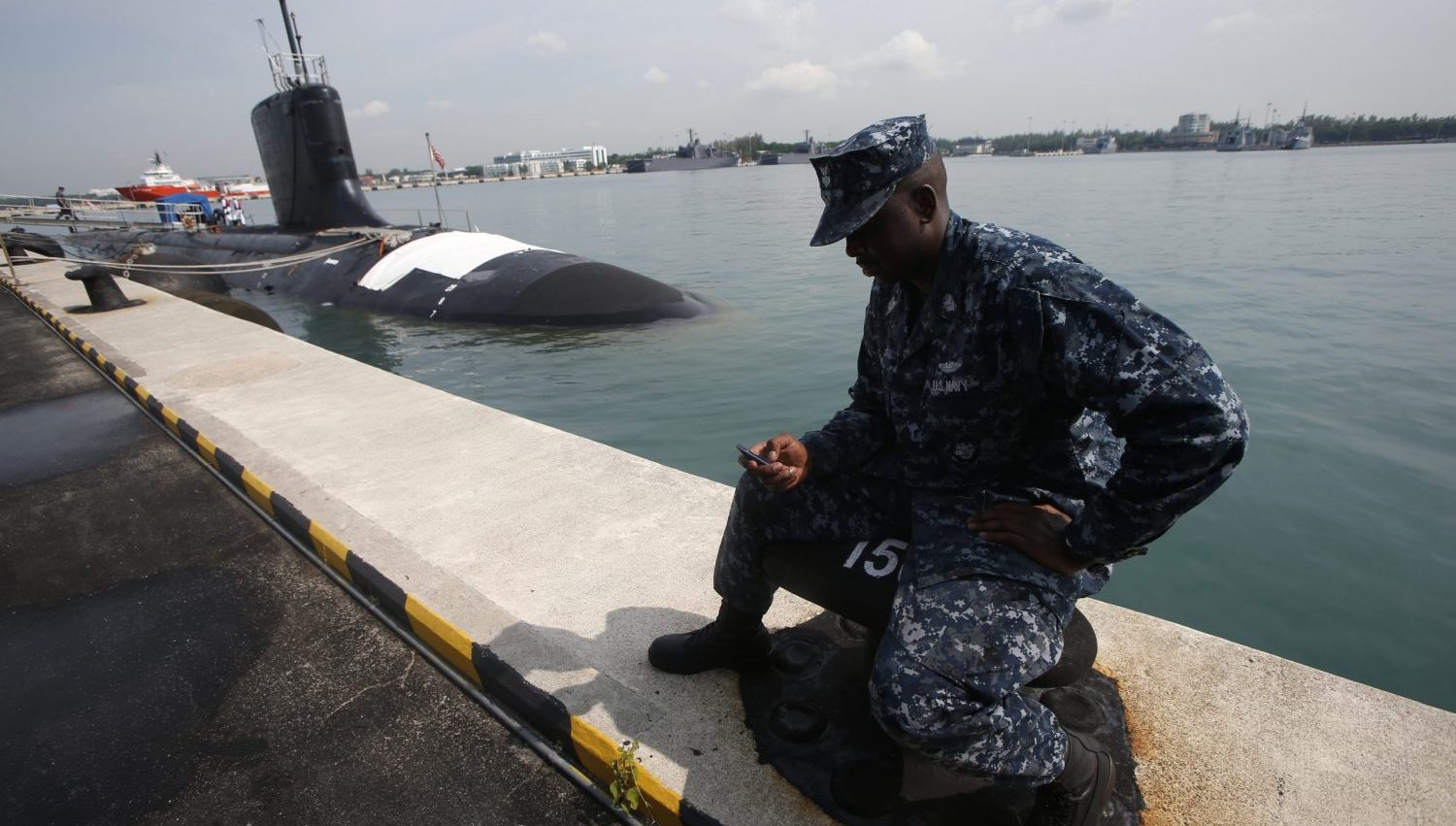 Image: A US Navy service member sits near the USS North Carolina (SSN-777) submarine docked at Changi Naval Base in Singapore April 28, 2014. Photo by Edgar Su/Reuters